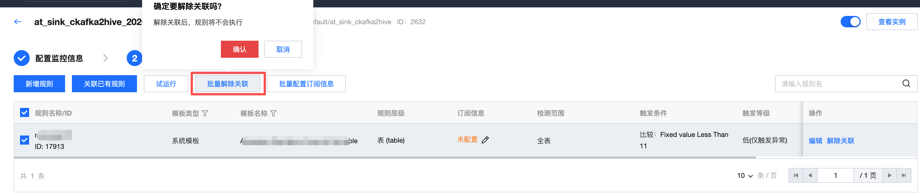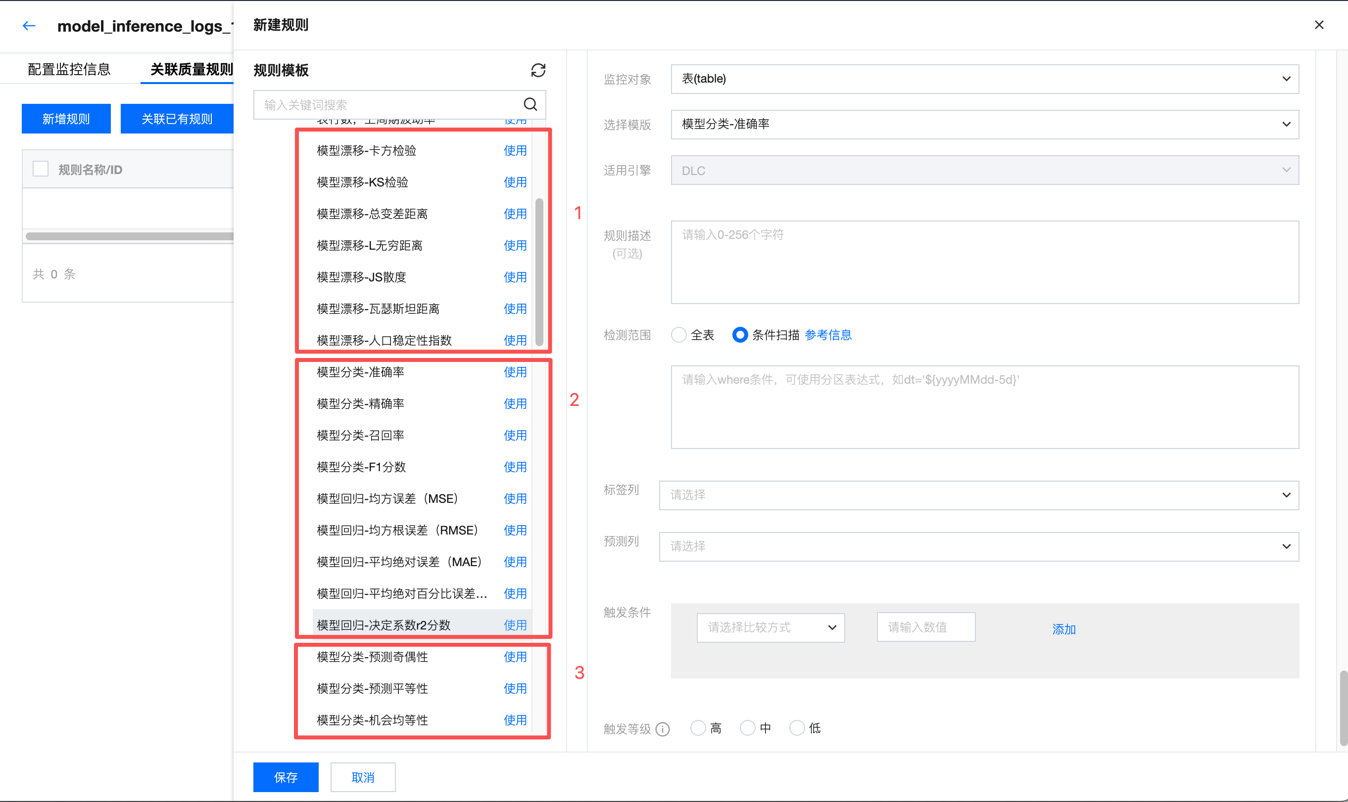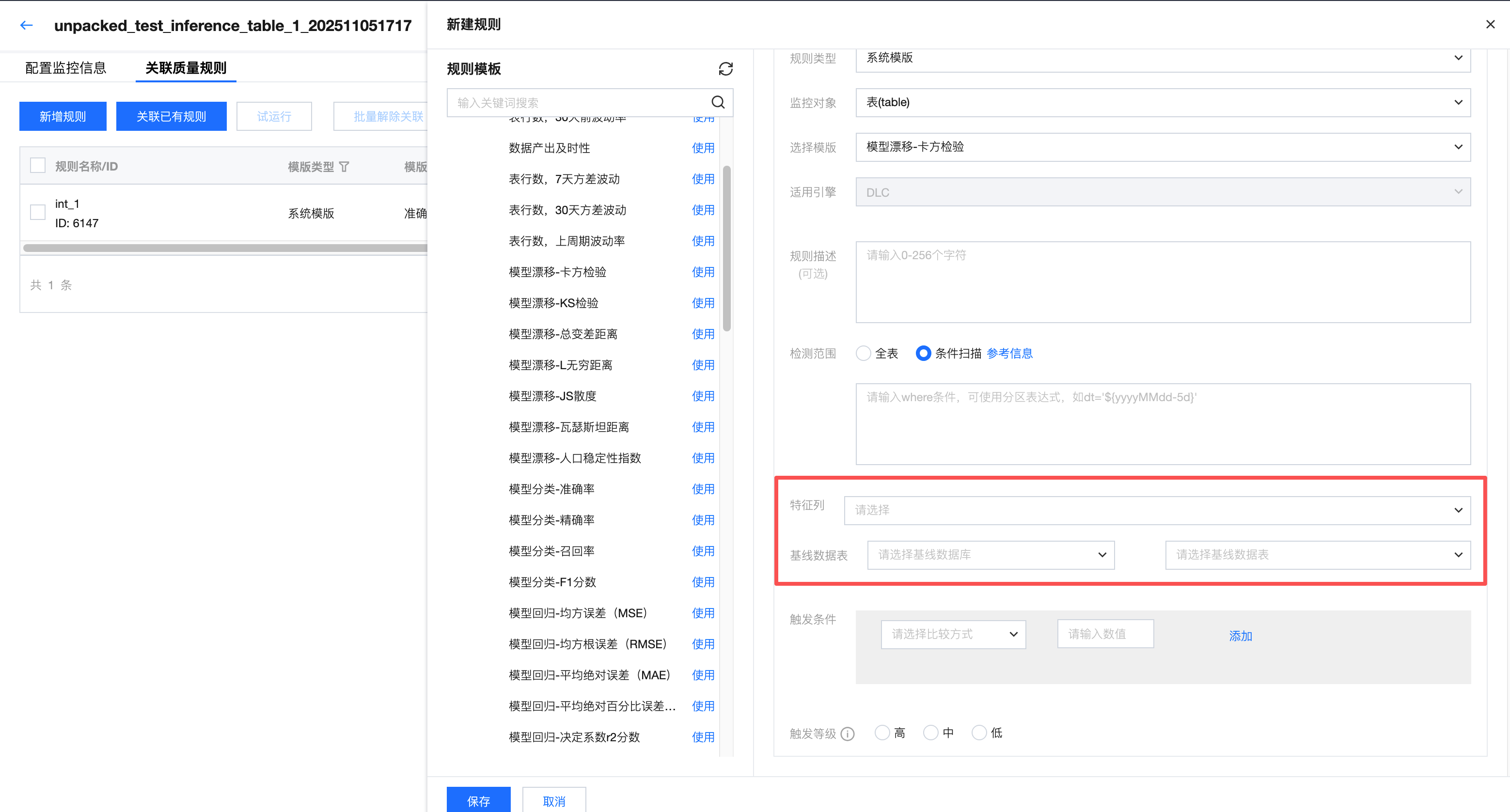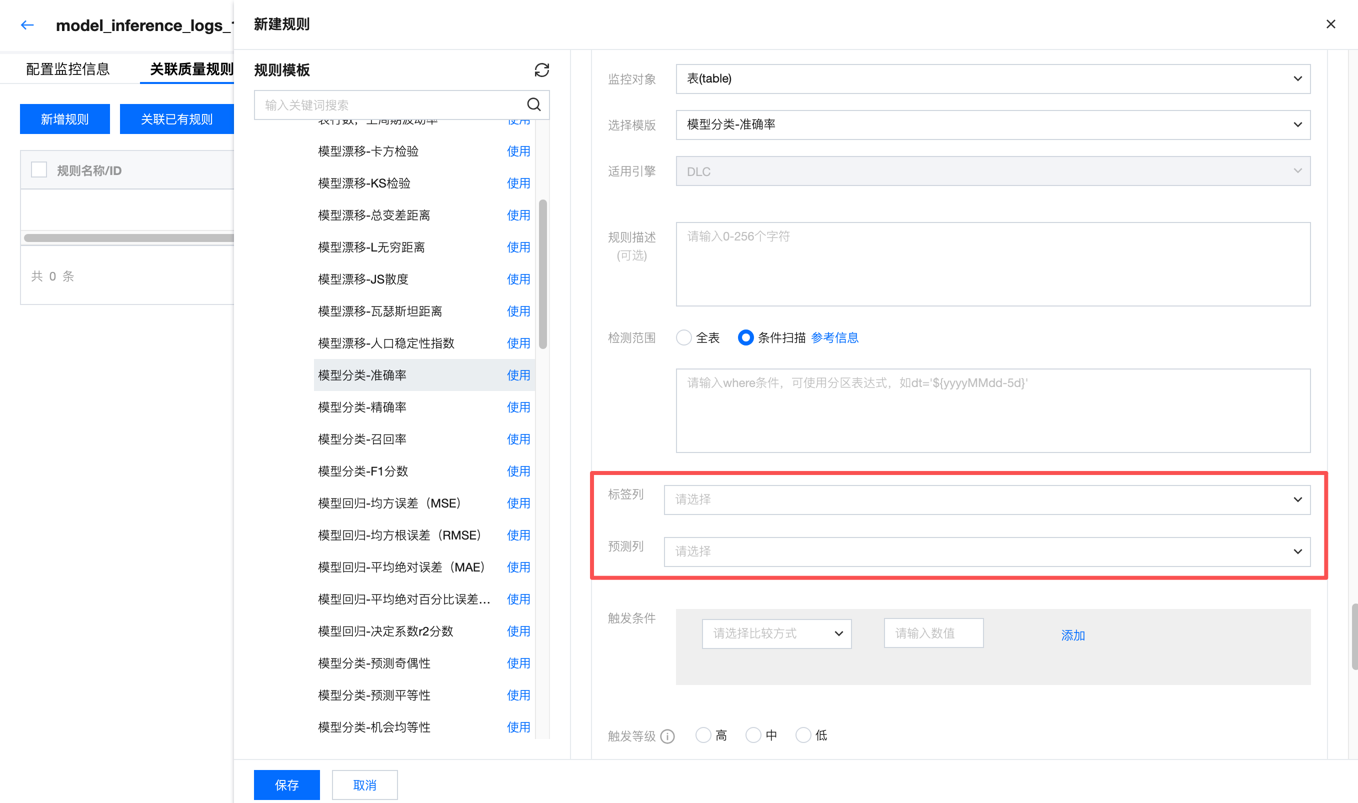 触发等级 | 选择中。 触发等级可分为:高、中、低。 高:当触发告警时,立即阻断下游任务执行(仅关联生产任务时有效)。 中:仅触发告警。 低:不触发告警,仅结果展示异常。 |