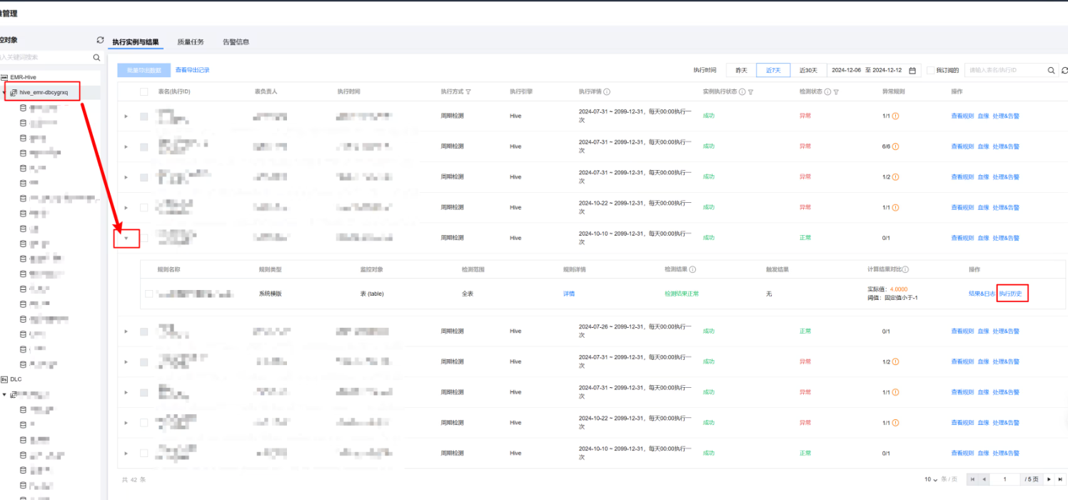 执行方式 | 此处可选择关联生产调度和离线周期检测: 关联生产调度:将质量任务与生产任务(数据同步任务或者数据开发任务)进行关联,当生产任务运行结束后,插入运行质量监控任务。如发现异常,会第一时间通知处理人进行处理,并根据监控下规则级别阻塞下游任务执行避免问题数据扩展: 说明: 同一个质量检测任务可以关联多个生产任务;同一个生产任务也可以关联多个质量检测任务。 离线周期检测:即独立调度。对选定的数据库表、核心业务字段按天、按小时、按分钟等自定义频率设置周期性质量检测。质量任务会按设定的周期定时执行,如发现异常,会第一时间通知订阅人。 |