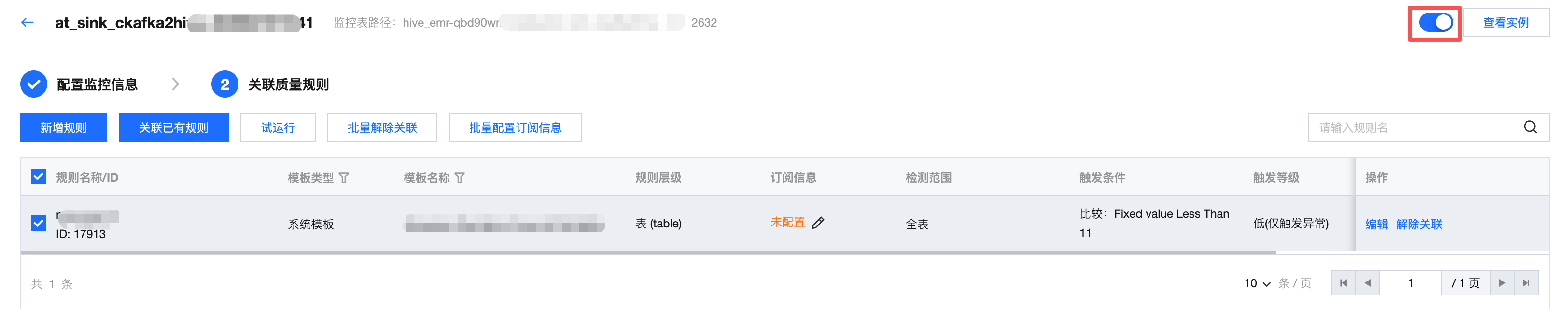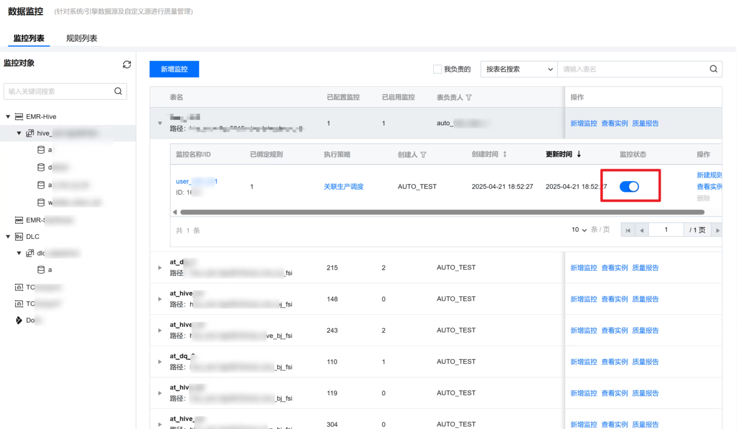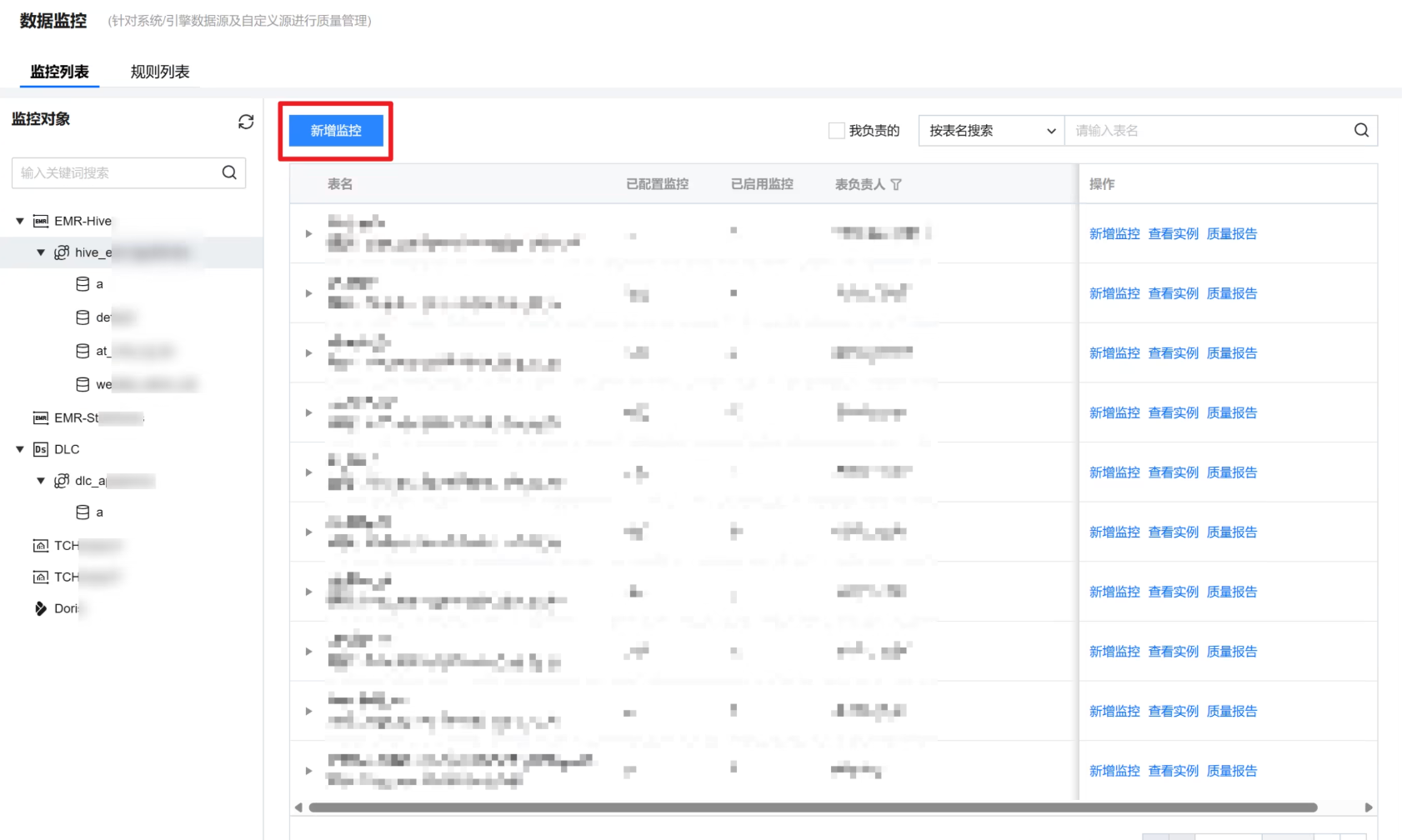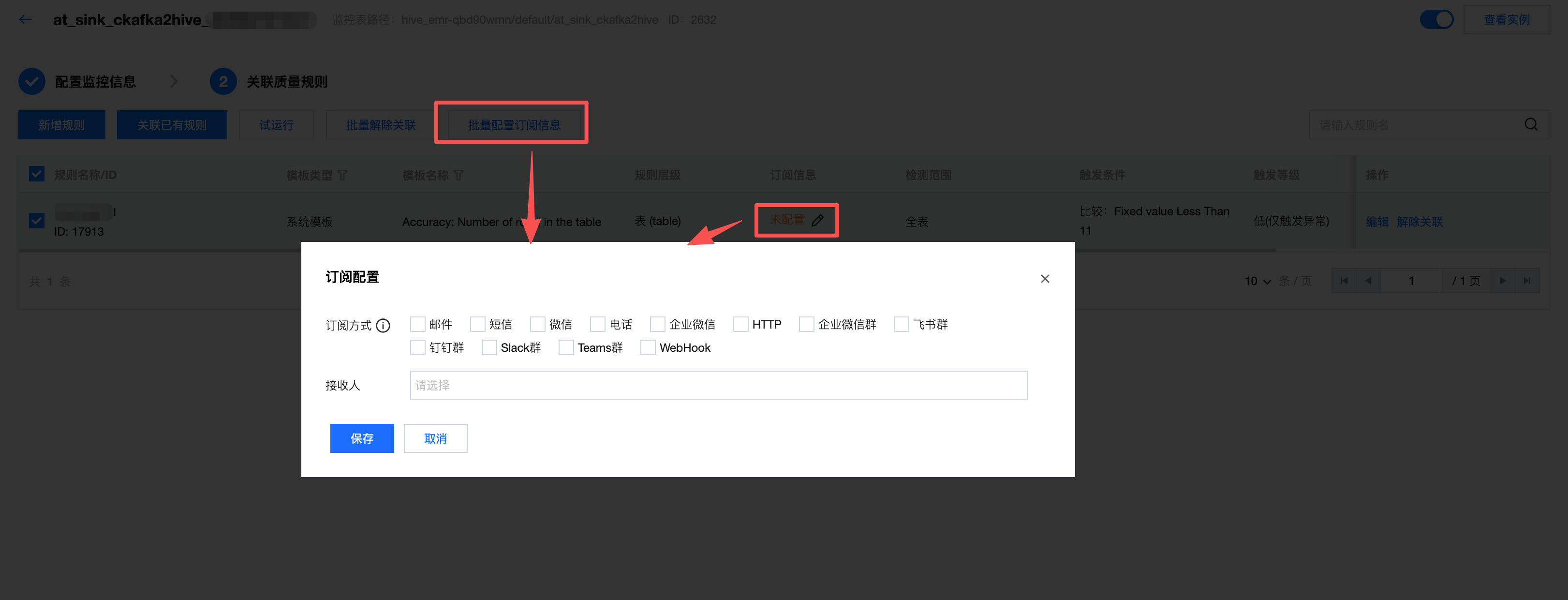 新增方式 | 目前 WeData 支持以下三种新增方式: 创建监控任务-新增规则:在监控下创建质量规则。 只能在一张表下新增规则(监控任务只能监控一张表)。 一次可添加多个规则。 多表新增:针对同一个数据源的多张表的多个字段批量创建监控规则。 一次可选择多张表、多个字段。 一次只可选择一个监控规则。 批量上传:上传 Excel 模板,批量导入。 一次只可针对同一种数据源类型。 只能支持自定义 SQL(不支持内置模板和自定义模板)。 一次只可上传100条。 |