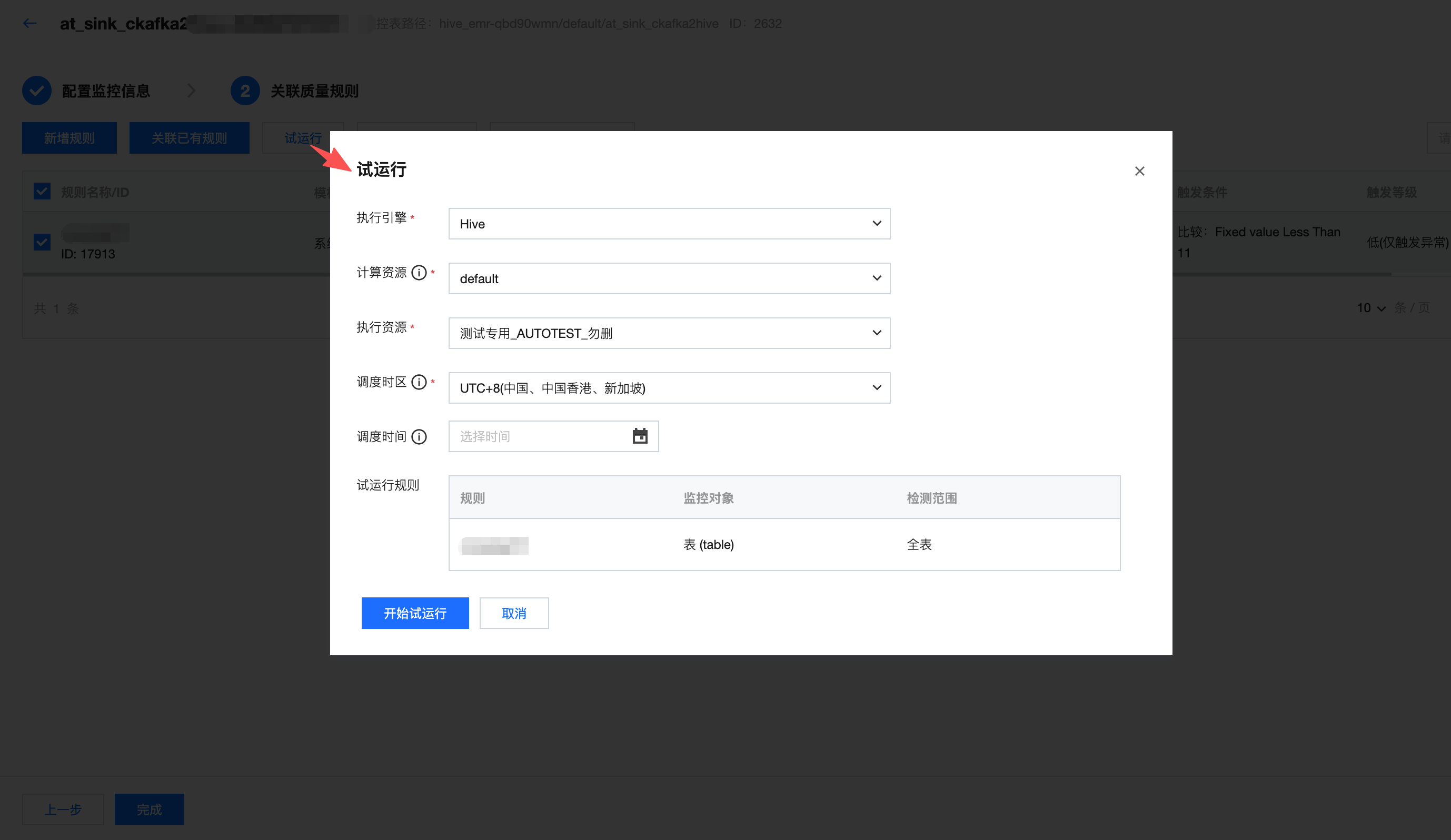 检测范围 | 可以选择全表或条件扫描。 全表:质量规则将对表下的全量数据进行校验 条件扫描:质量规则将只对此处填写的检测范围进行校验 例如: