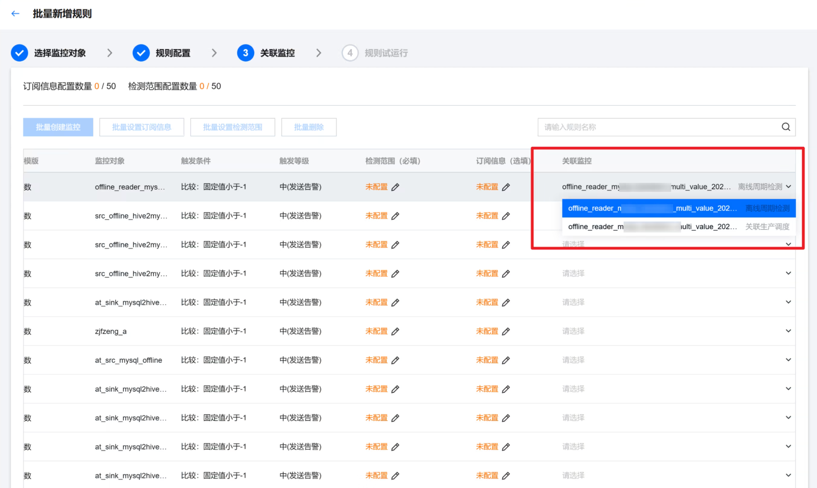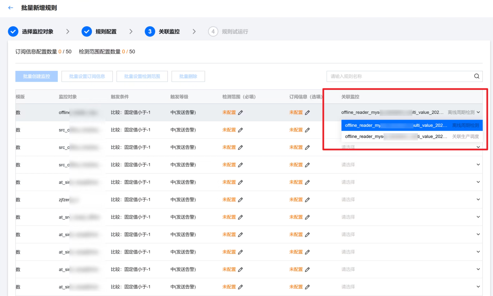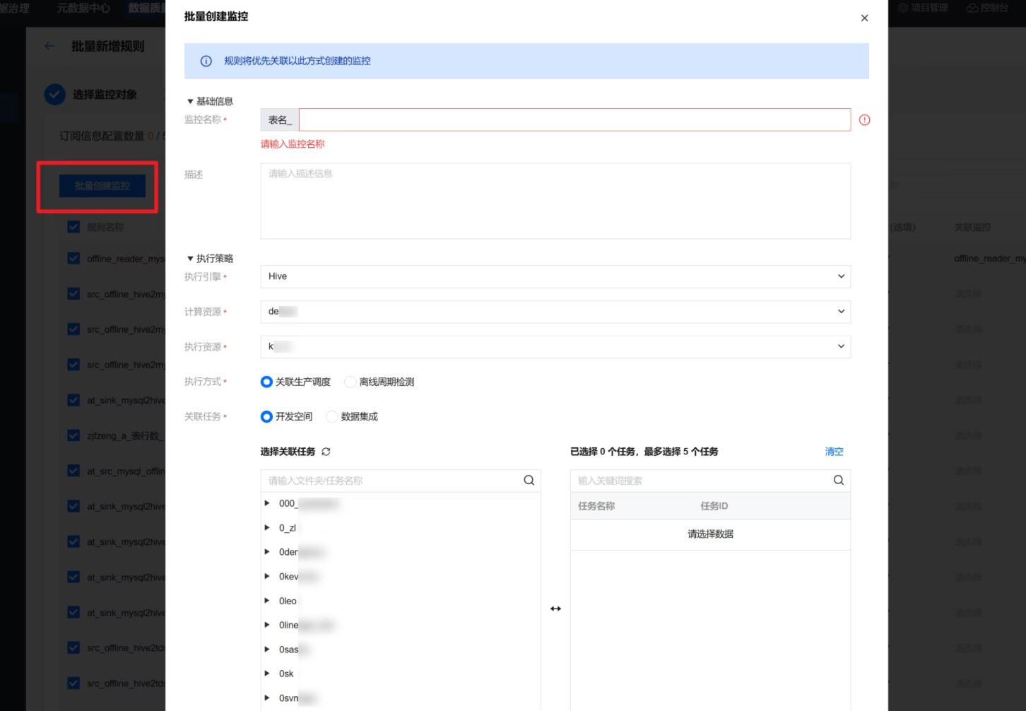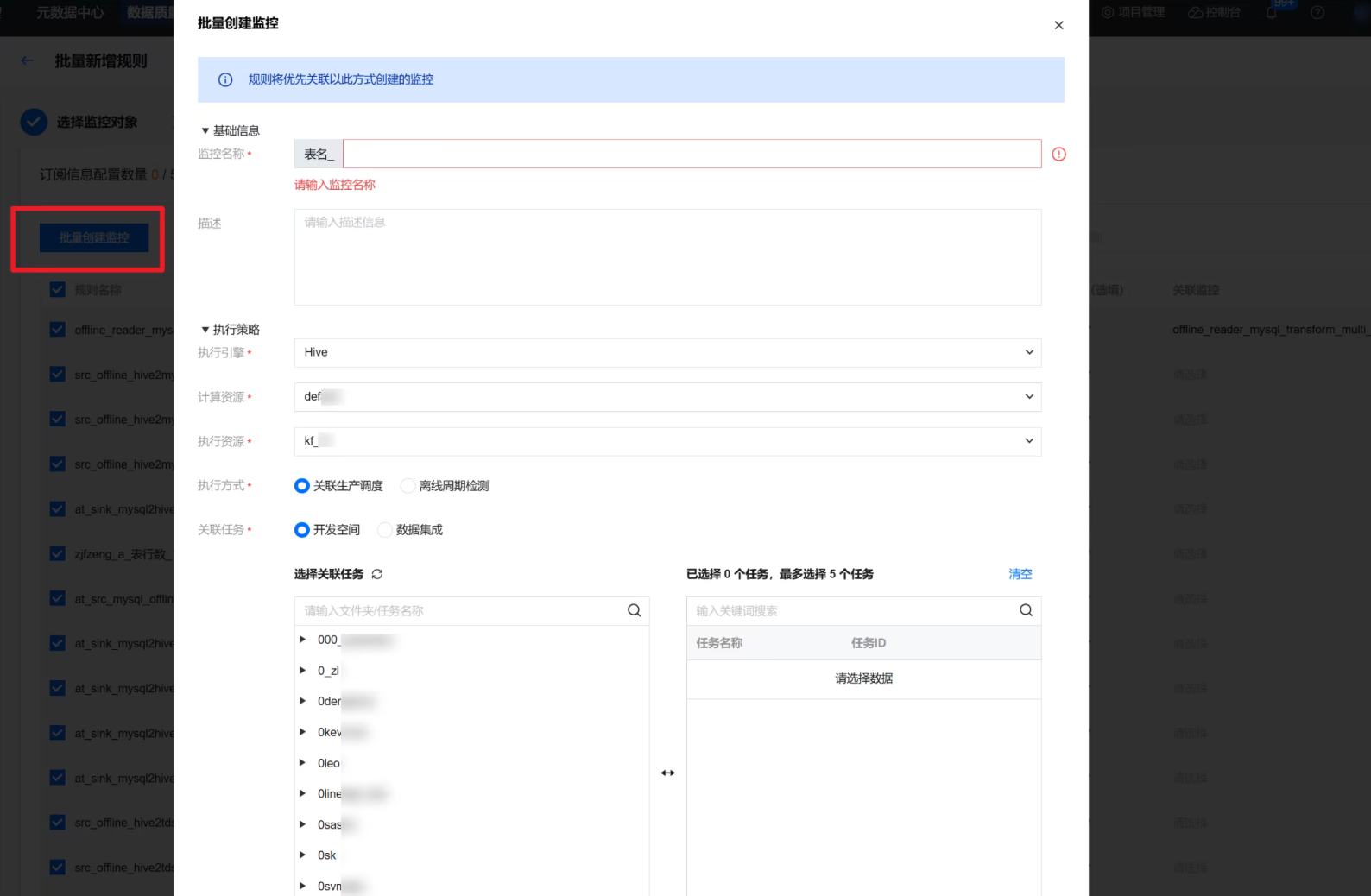 2. 如果需要批量新建并关联质量监控任务,可以选择对应的规则并单击批量创建监控。