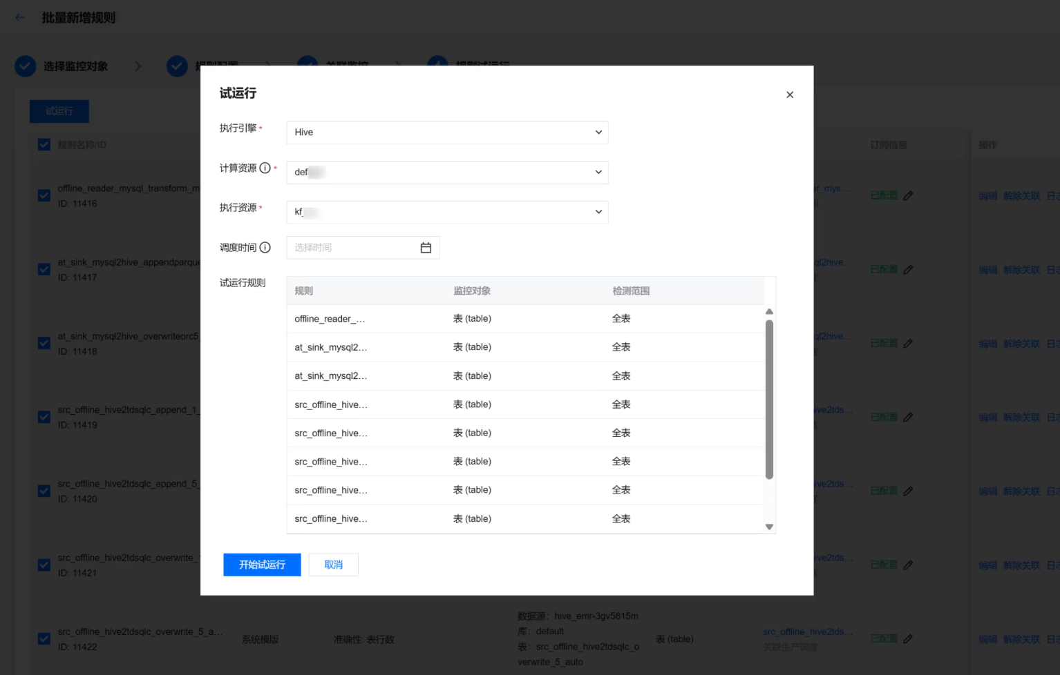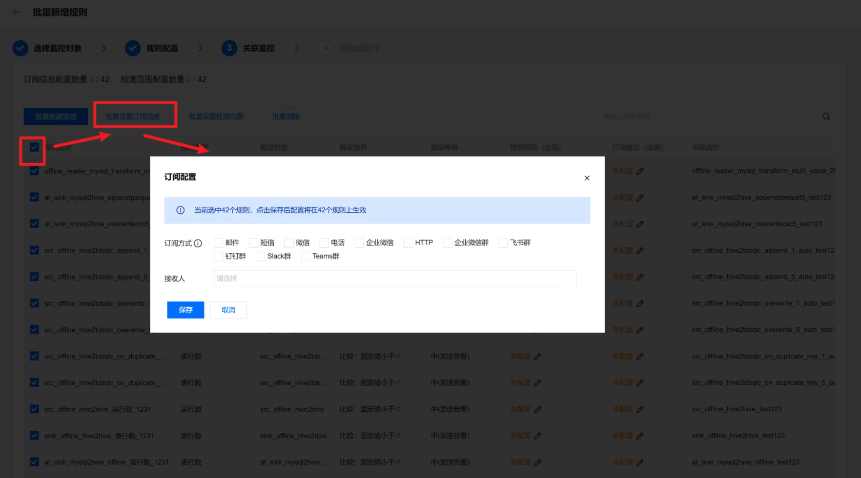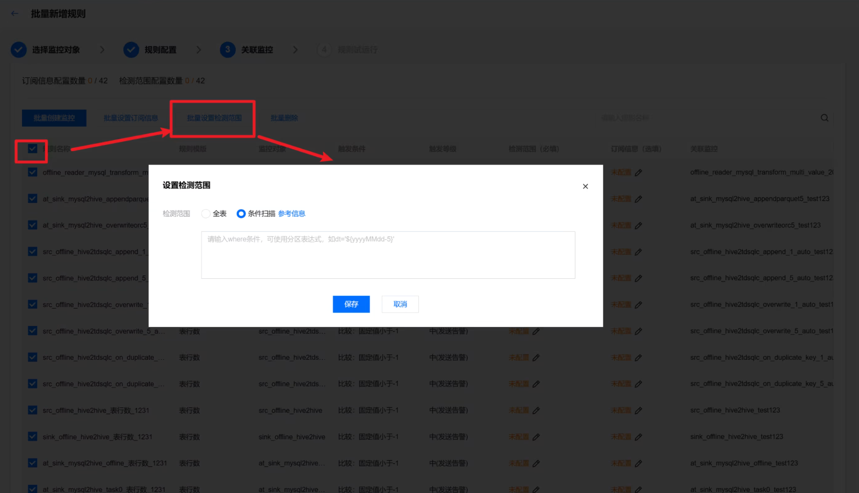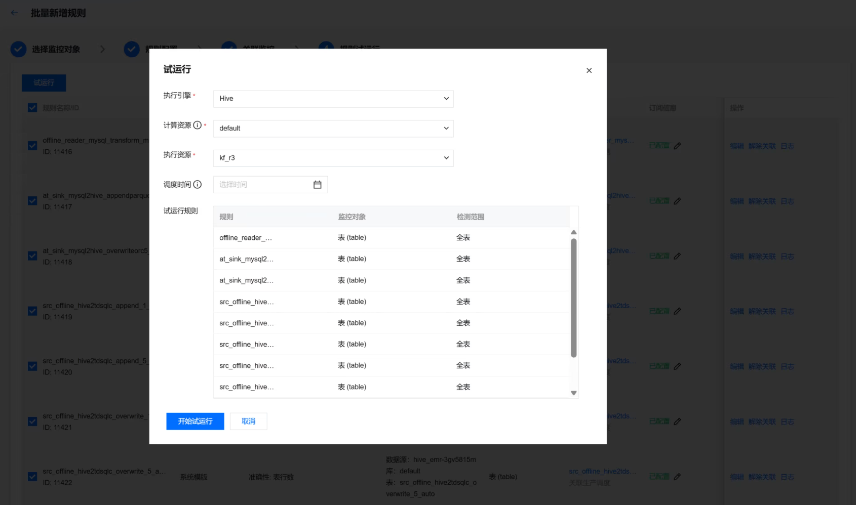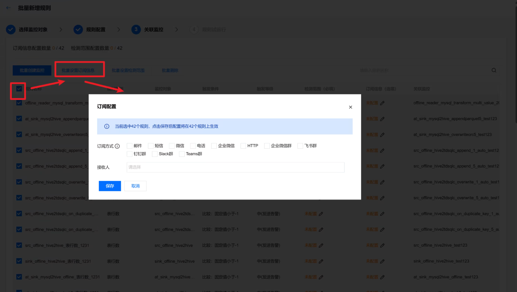 2. 如果需要批量新建并关联质量监控任务,可以选择对应的规则并单击批量创建监控。