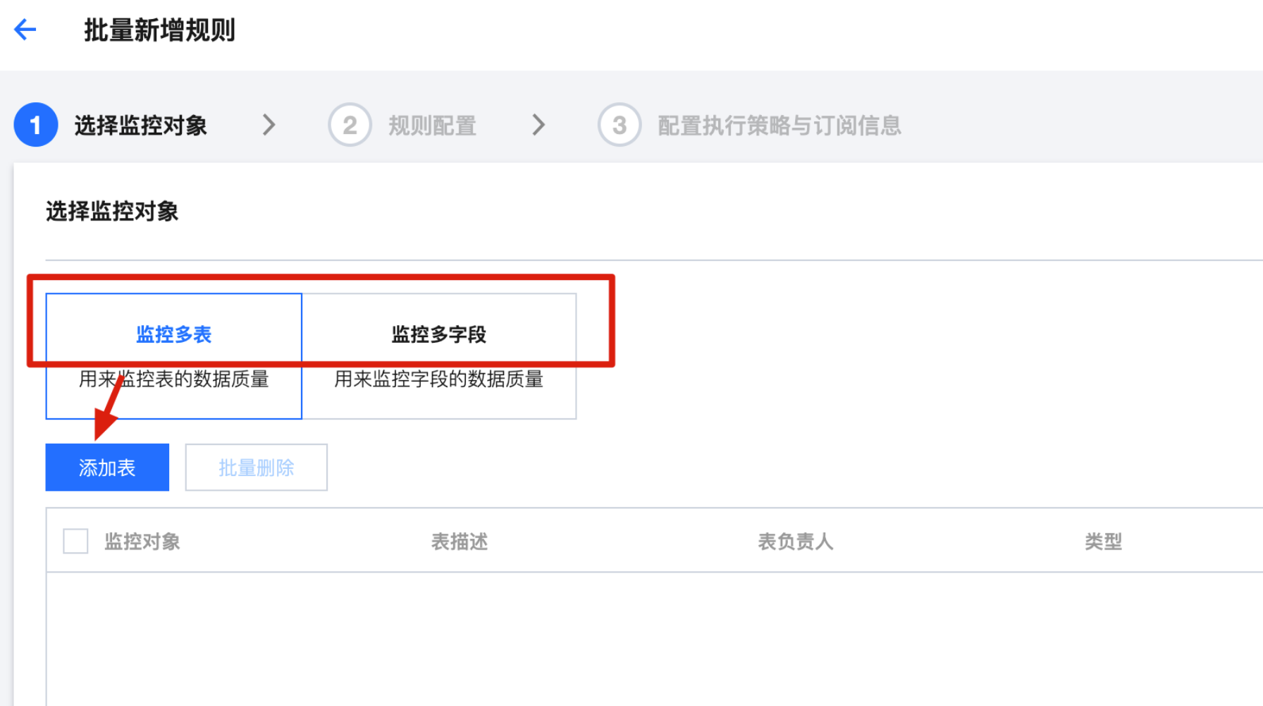 1. 单击批量新增规则,进入批量新增规则界面,您可选择监控多表或监控多字段。