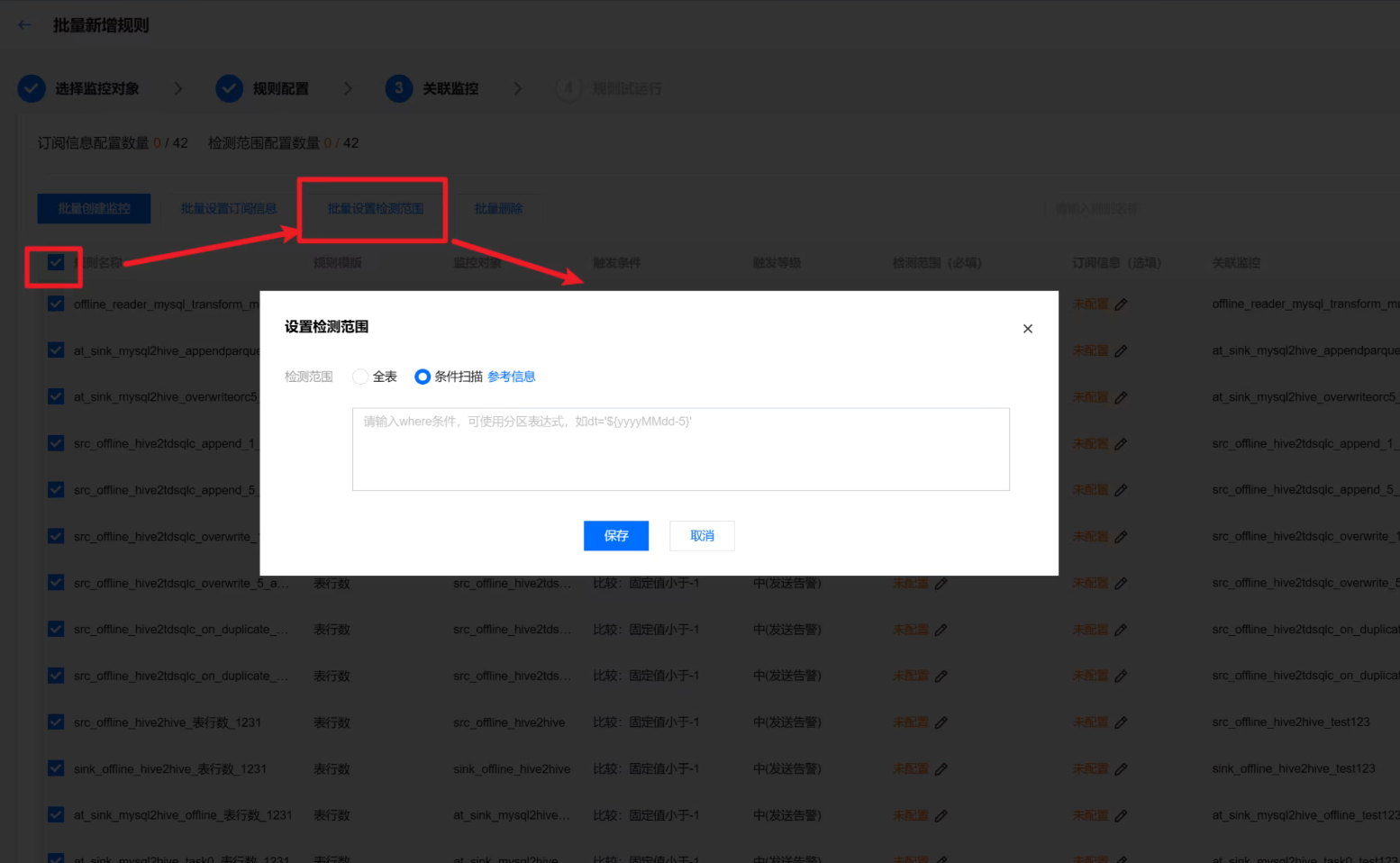 2. 如果需要批量新建并关联质量监控任务,可以选择对应的规则并点击批量创建监控。