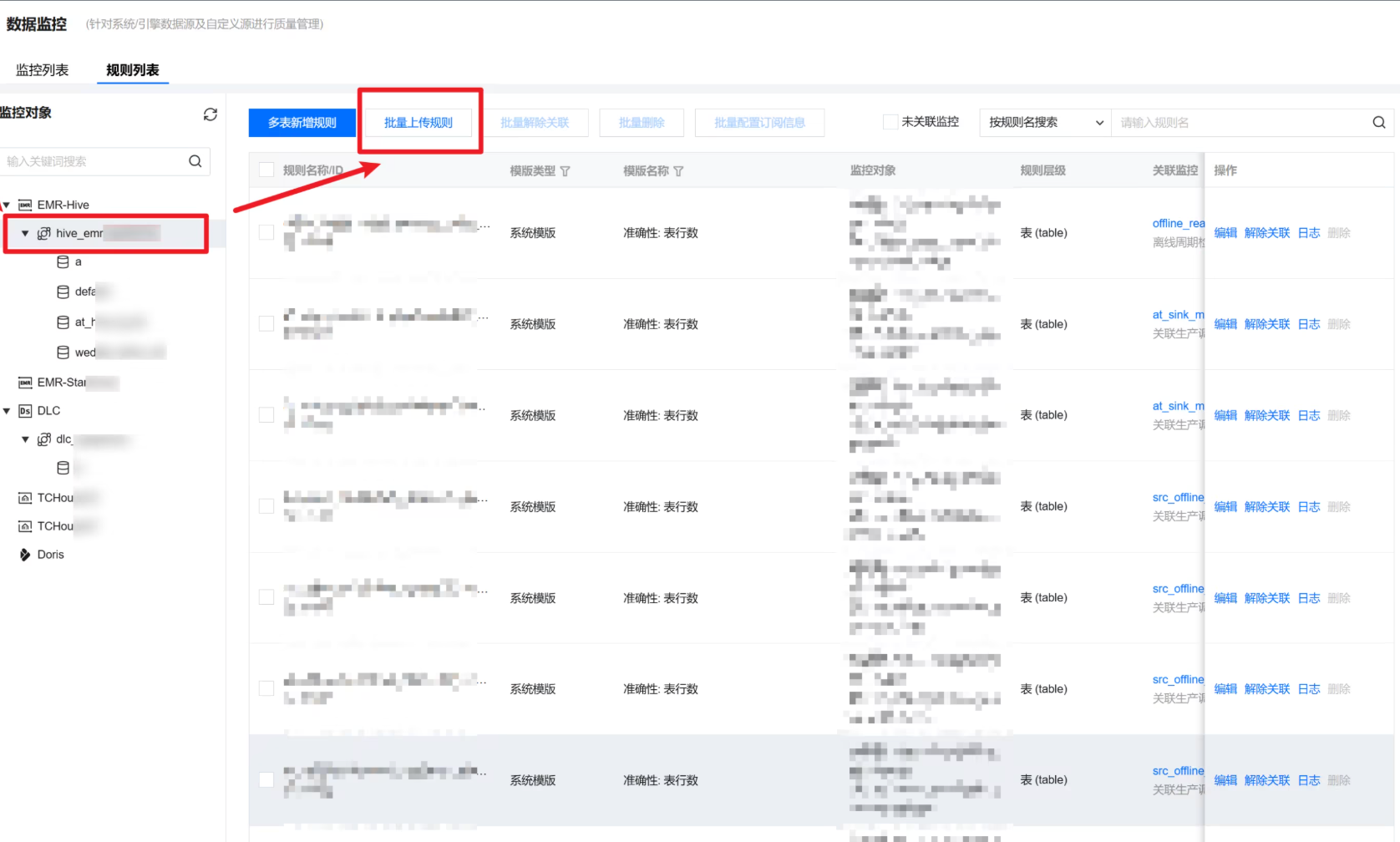 进入数据质量 > 数据监控 > EMR 界面,单击批量上传规则,即可新增多个质量规则。