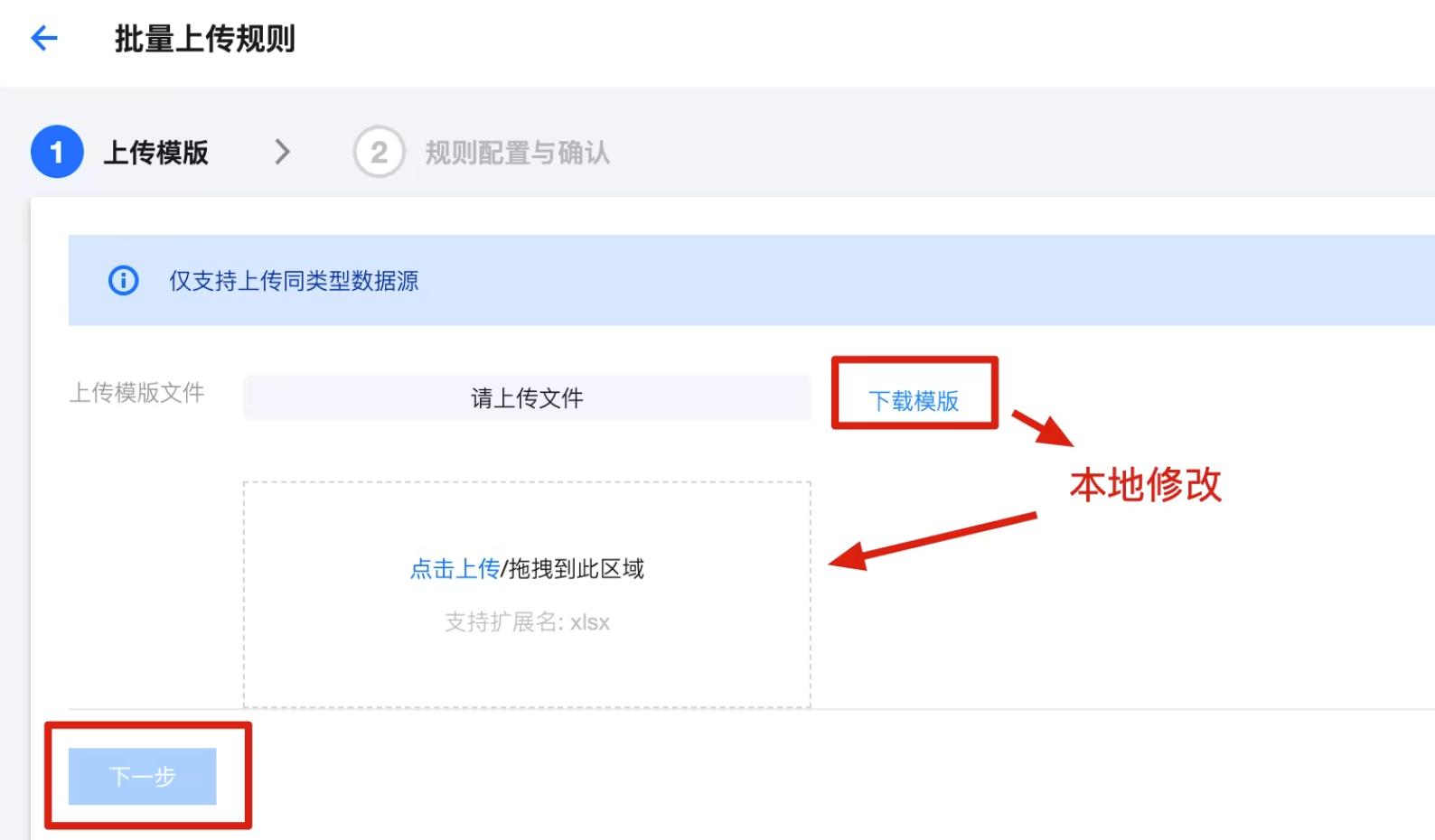 1. 进入数据监控 > 批量上传规则界面,在上传模板界面,单击下载模板,本地修改后,单击点击上传,即可上传模板。