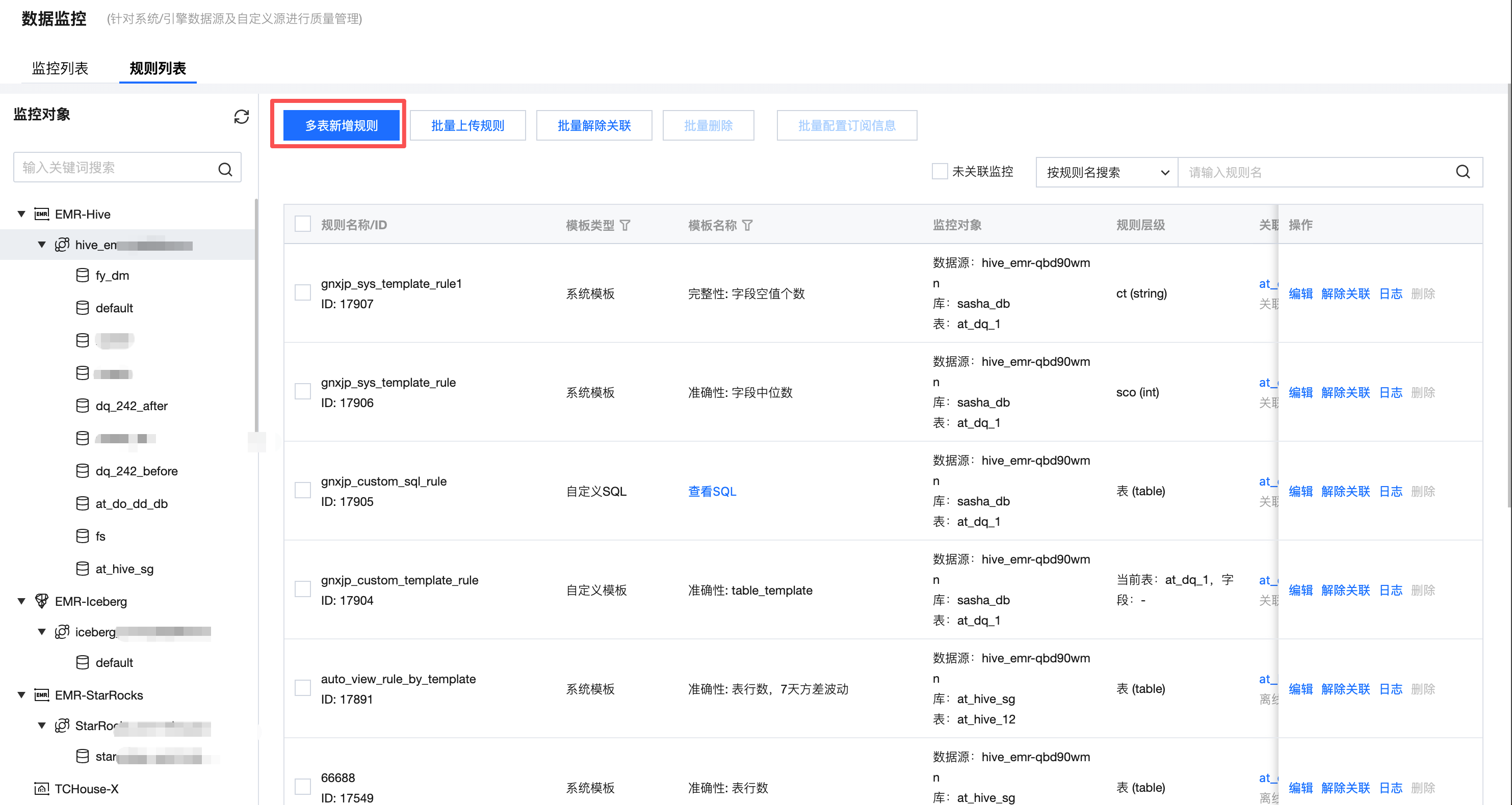 进入数据质量 > 数据监控 > EMR 界面,单击多表新增规则,开始新增多个质量规则。
