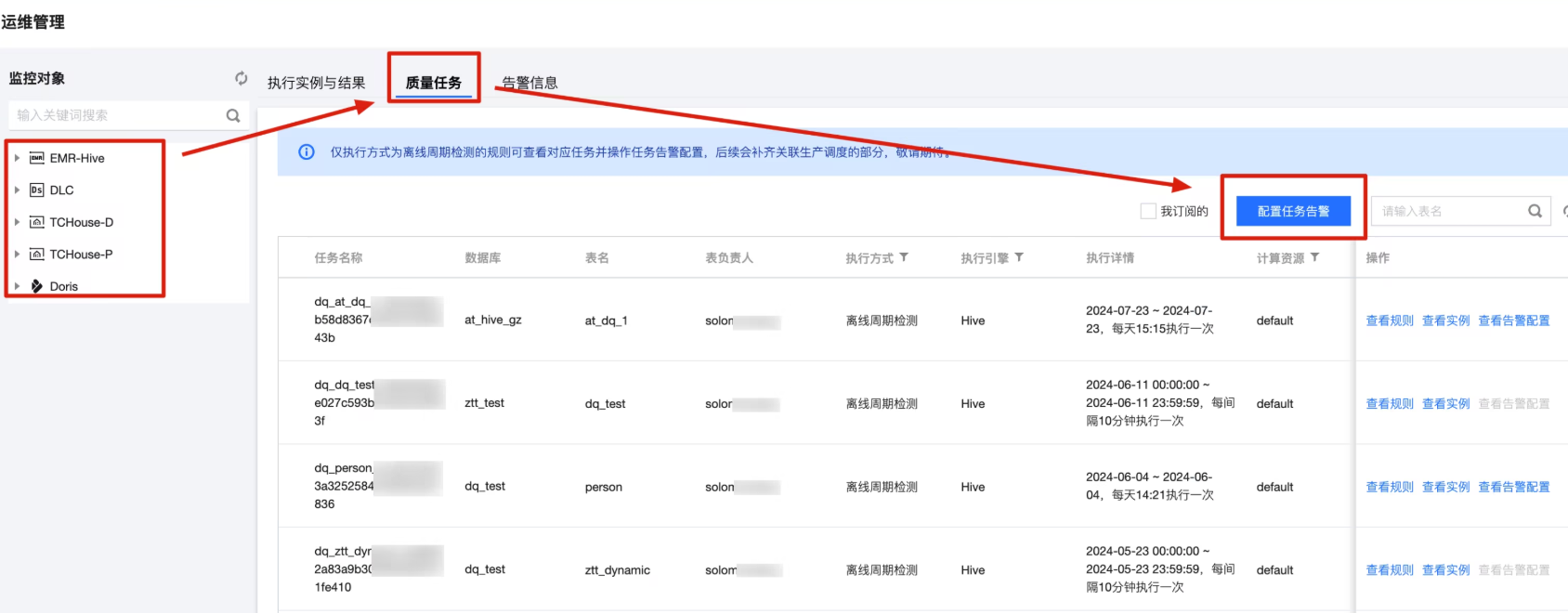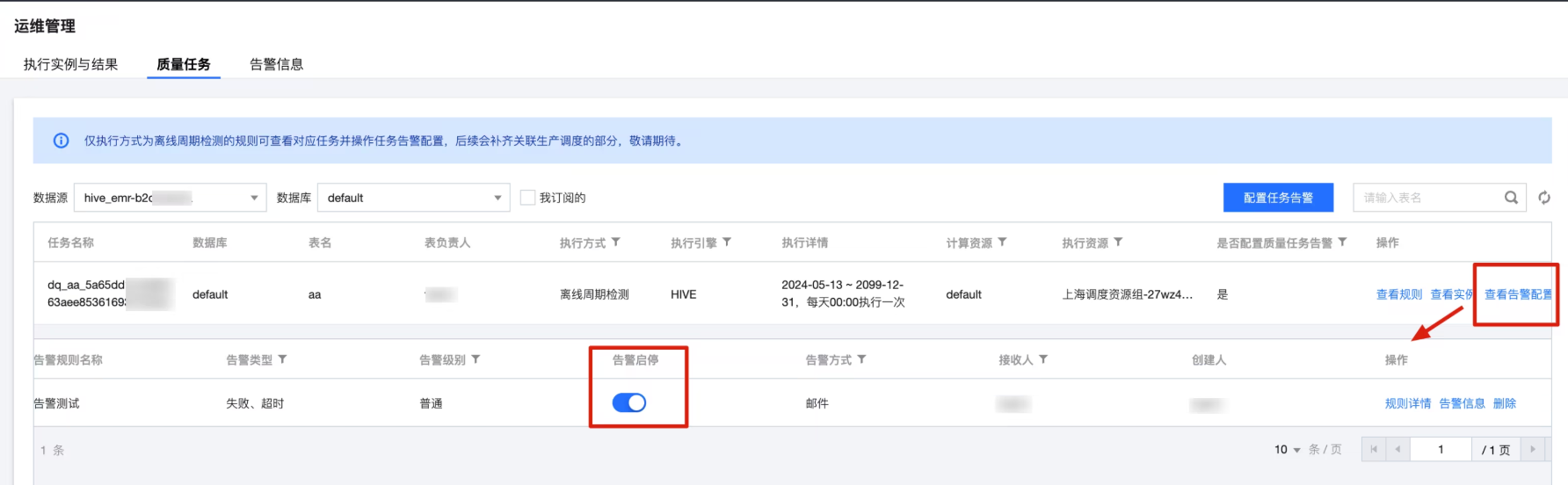 1. 进入运维管理 > 质量任务界面,在质量任务列表中,单击查看告警信息,即可在操作栏查看规则详情和查看告警信息。