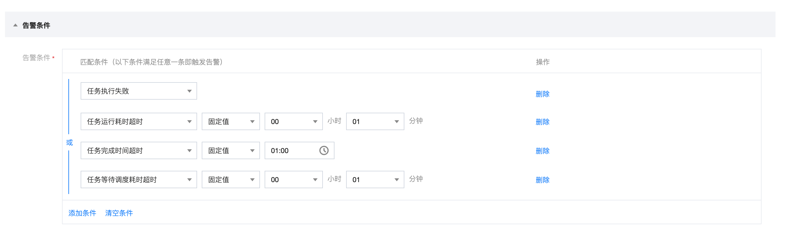 可设置告警条件:任务执行失败,任务运行耗时超时,任务完成时间超时,任务等待调度超时。