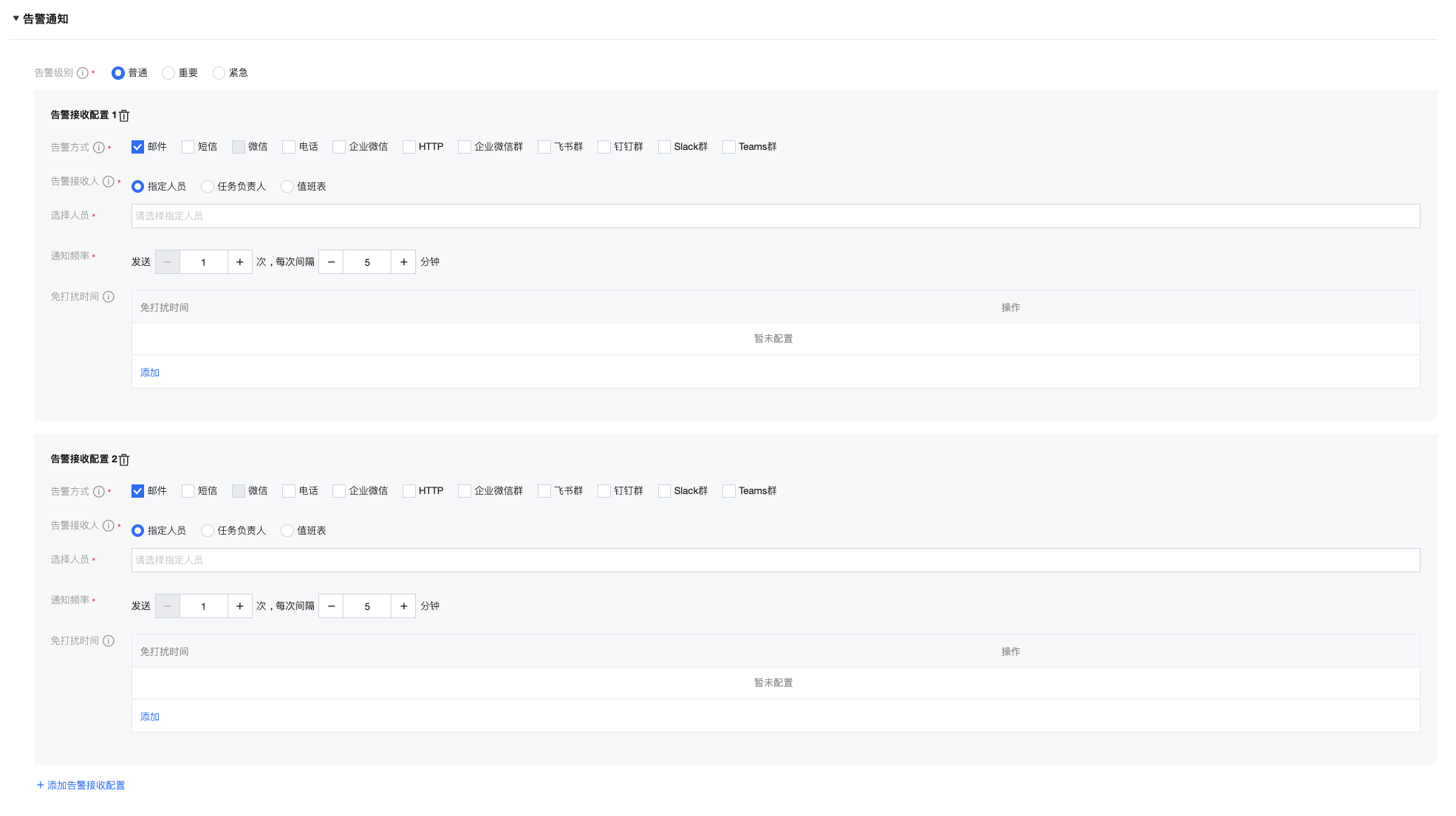 可在此处设置告警级别、方式、接收人、频率以及免打扰时间。点击“添加告警接收配置”可以设置多组告警通知。