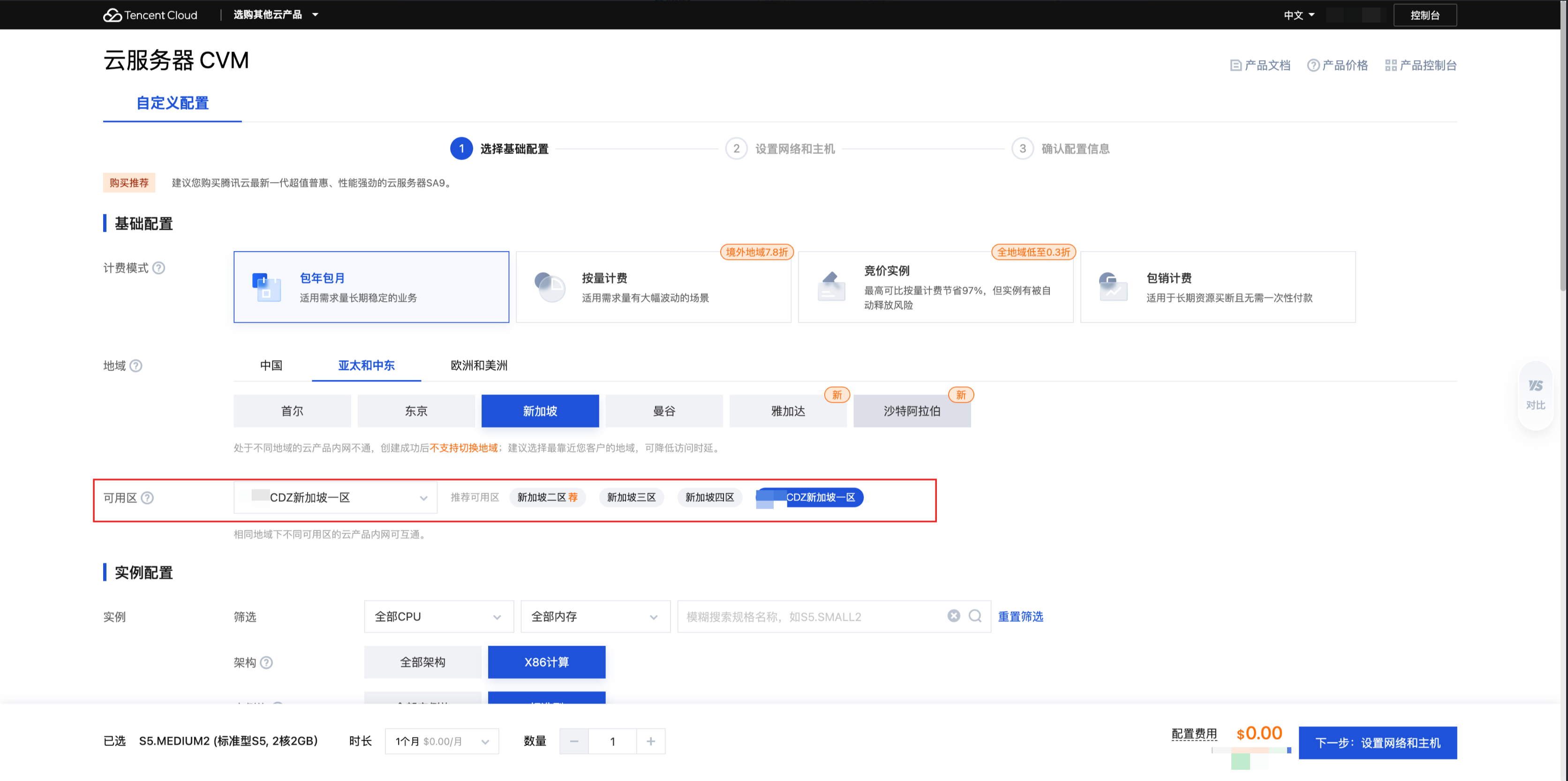 3. 地域选择 CDZ 可用区所在地域,可用区选择对应的专属可用区。