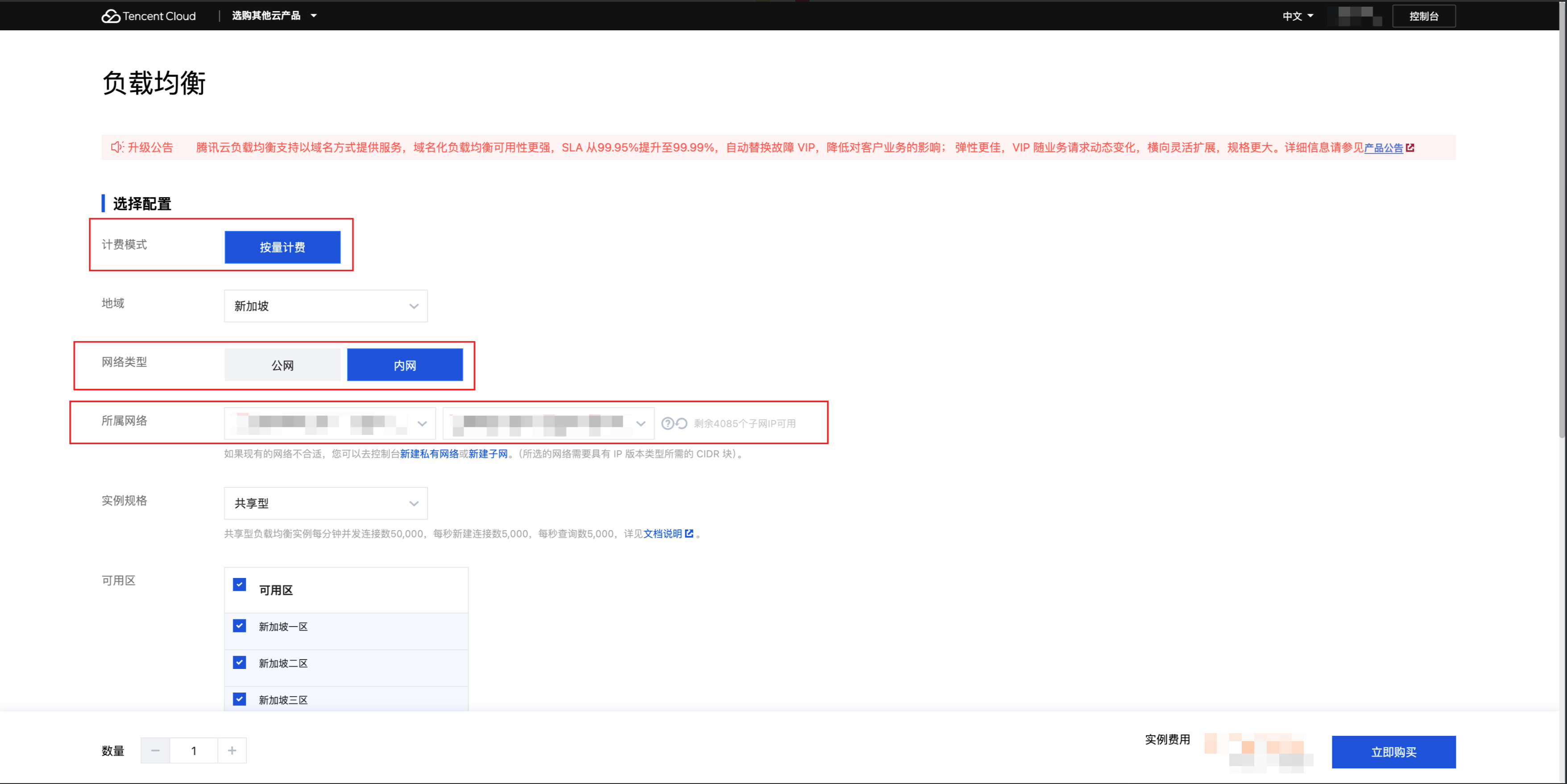 1. 创建内网 CLB 实例:登录 负载均衡控制台,在 CDZ 主 Region 创建一个新的 公网负载均衡 CLB 实例,在CLB控制台页面,单击新建,为负载均衡选择配置: 计费模式:选择按量计费。