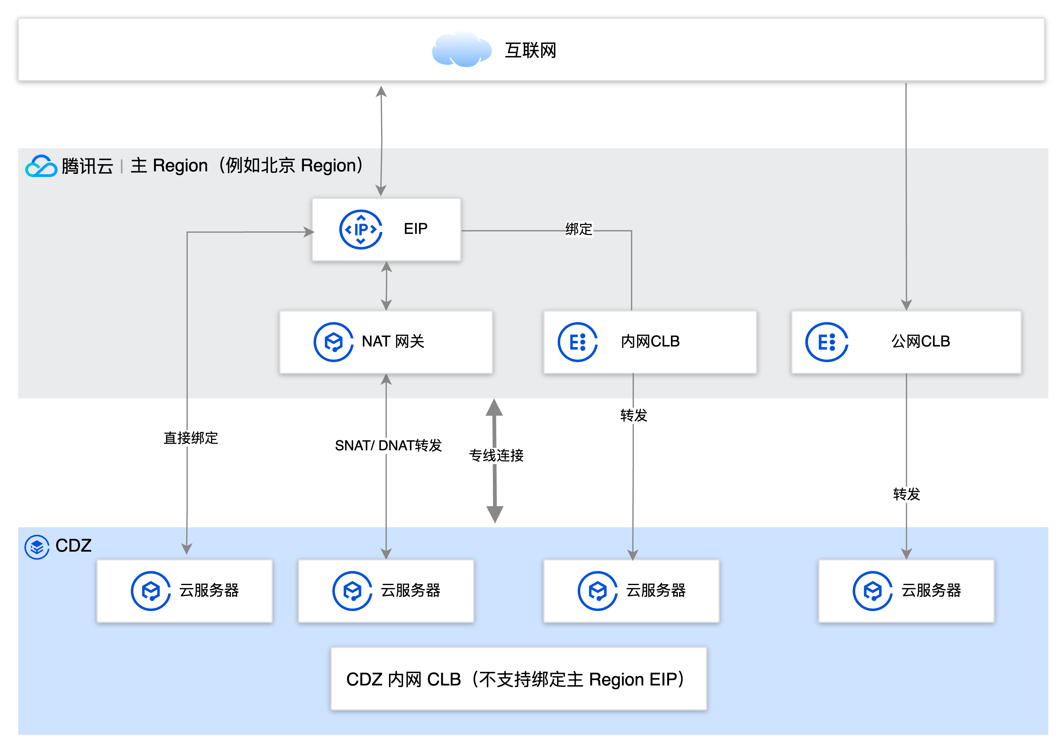 A:CDZ 内网 CLB 无法直接绑定 Region EIP。CDZ 中的内网 CLB 是为 VPC 内部流量场景设计的负载均衡服务,仅提供私有 IP,本身不具备公网访问能力,也 不支持绑定 Region EIP 或暴露公网 IP。因此: