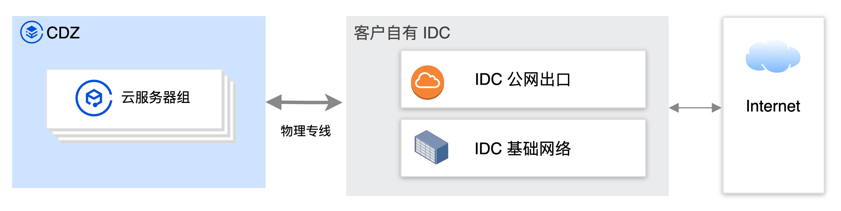 核心路径 | 使用所属 Region 的公网能力 | CDZ 内 CVM → 专线 → 自有 IDC 内部网络 → IDC 的公网集群 → 互联网 | 使用本地公网集群访问互联网 |