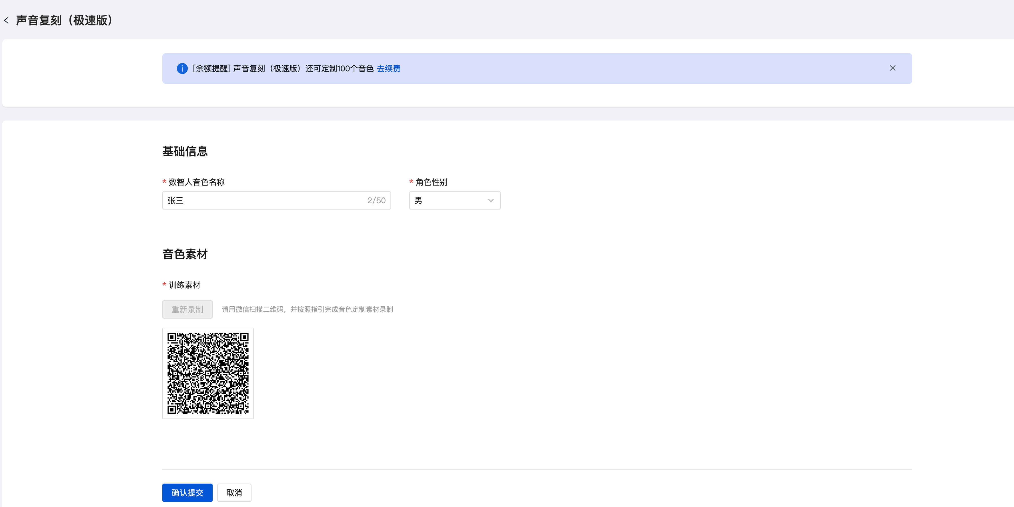 购买额度后,您可通过平台,直接录制素材来进行声音复刻。