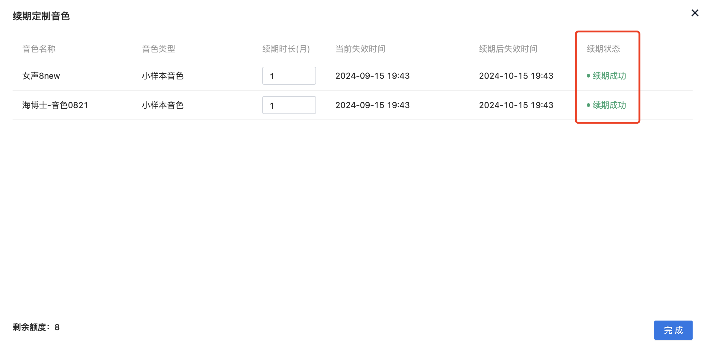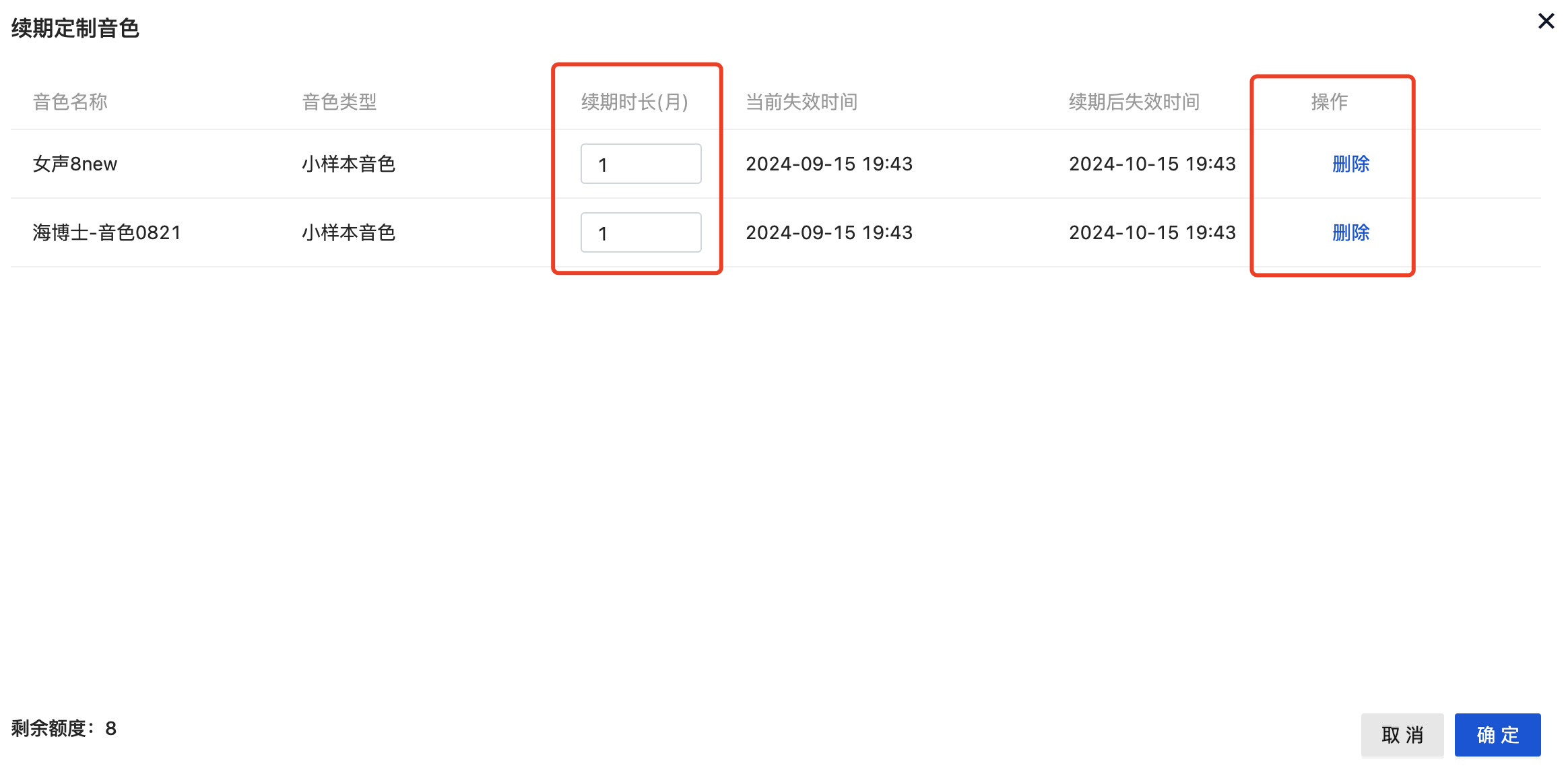 单击确认续期,进入二次确认页面。页面中展示了续期操作对应的复刻声音列表,也可以在本页面对续期时长和声音进行调增和调减。