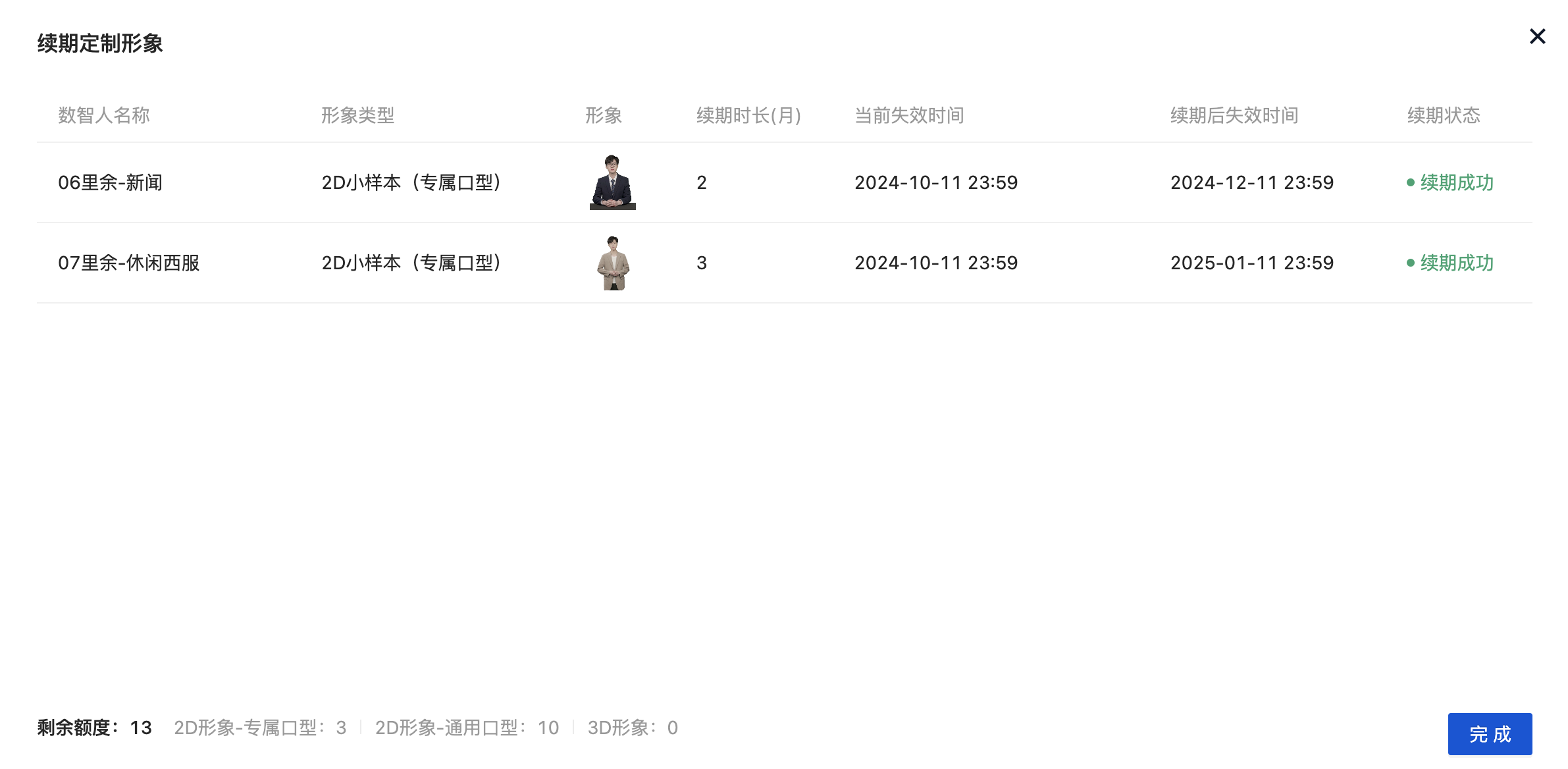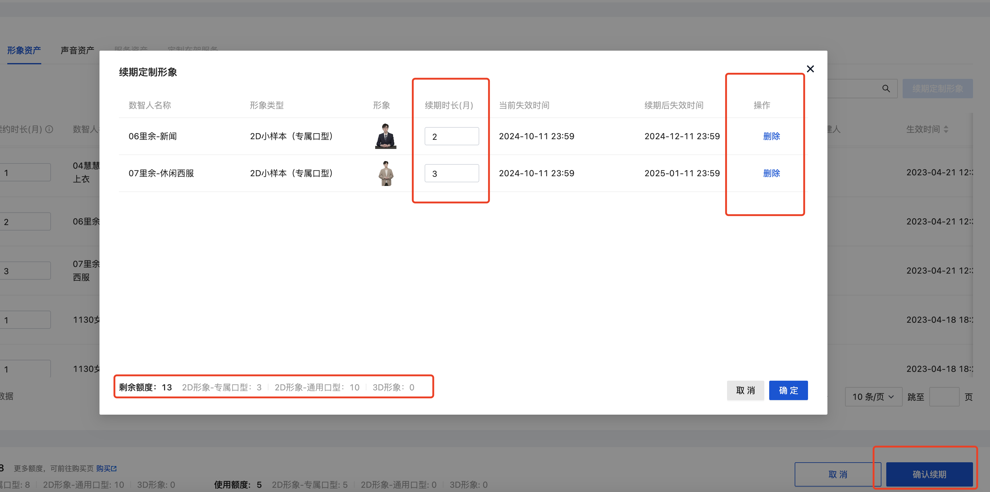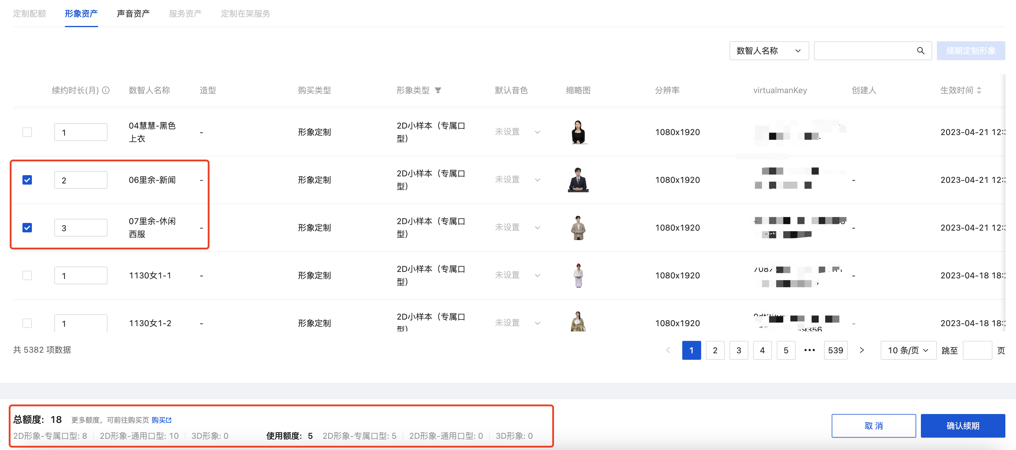 对不同形象可设置不同的续期时长,一个额度对应续期时长为1个月。勾选的形象续期时长不可超过可用的总额度,若额度不足需要另外购买。