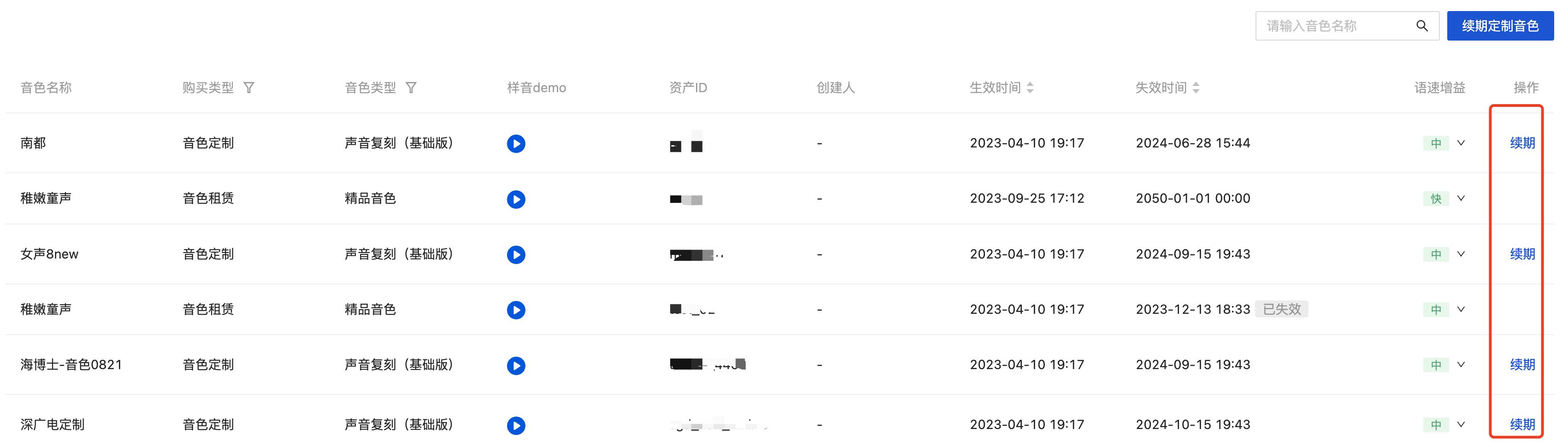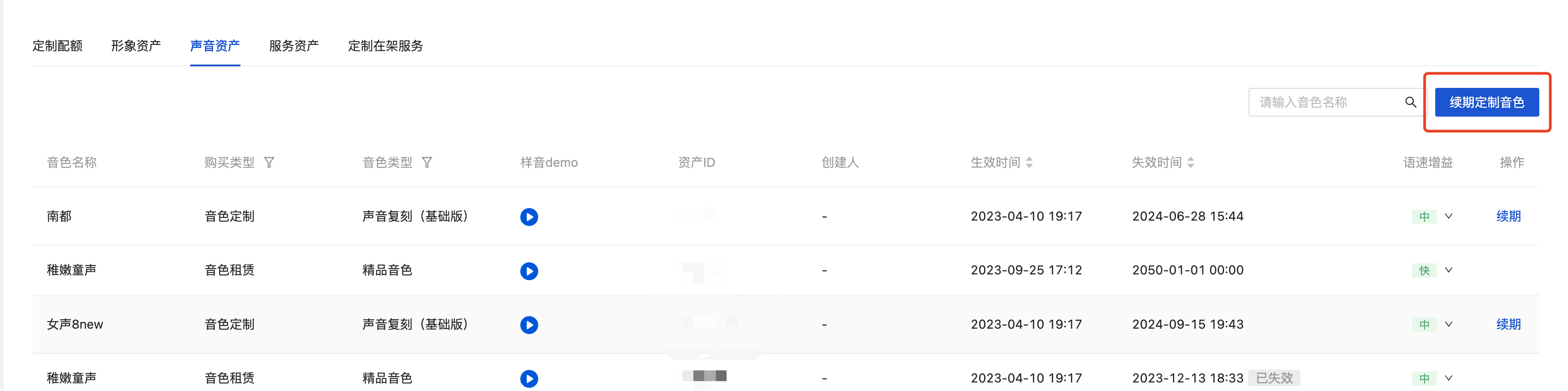 进入音色资产列表,可以通过点选或者搜索声音名称的方式对锁定续期形象,在操作列单击续期。