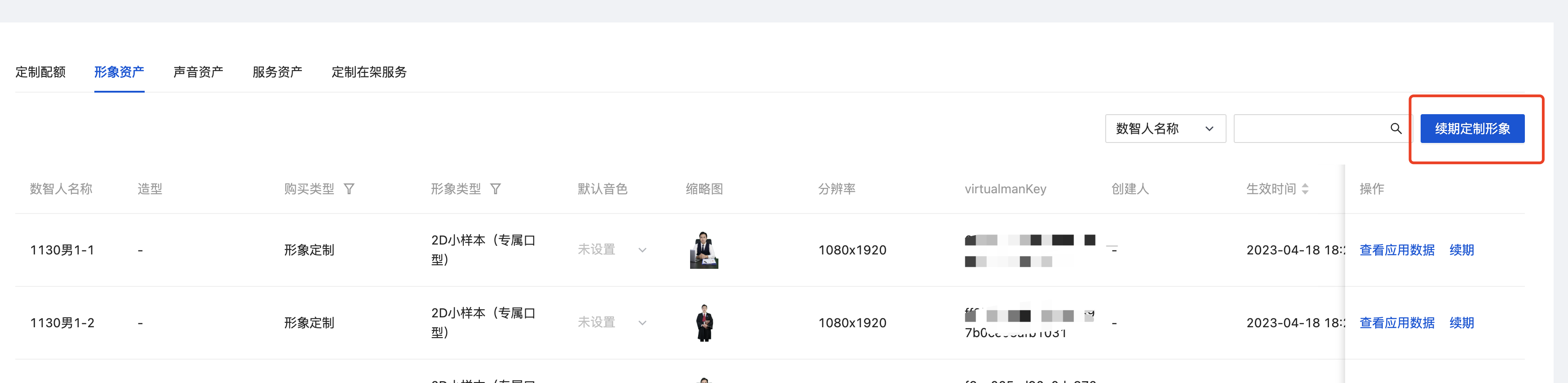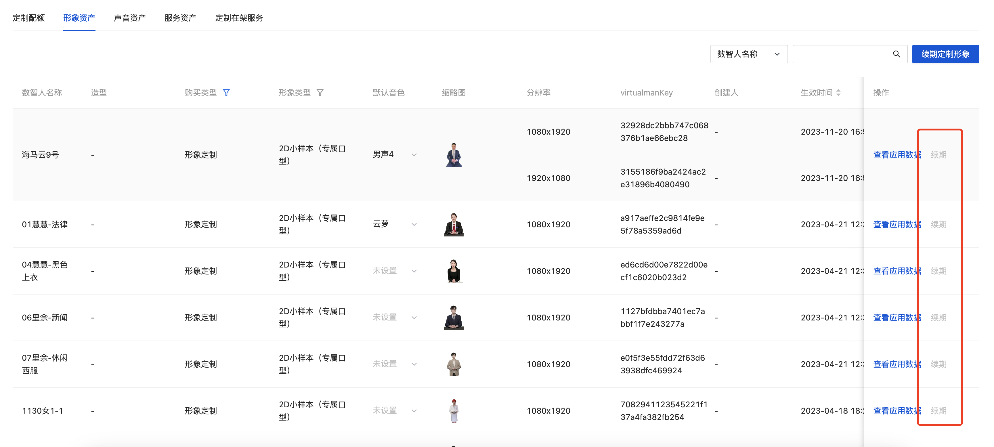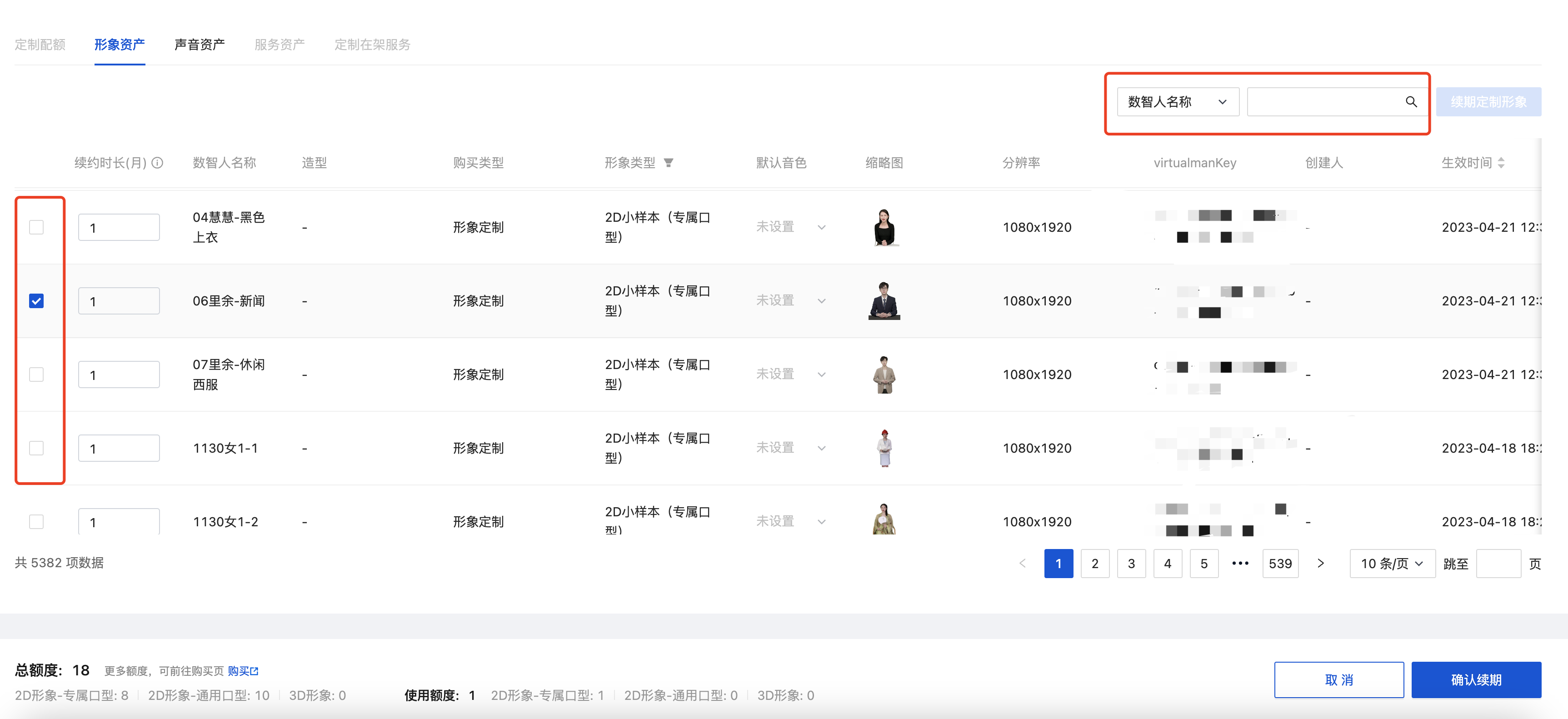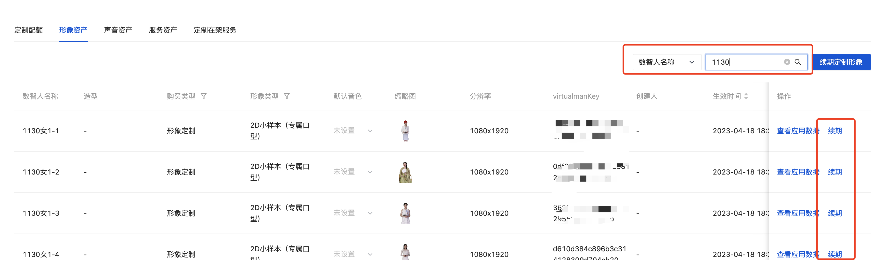 进入形象资产列表,可以通过点选或者搜索形象数智人名称/vk的方式对锁定续期形象,在操作列单击续期。