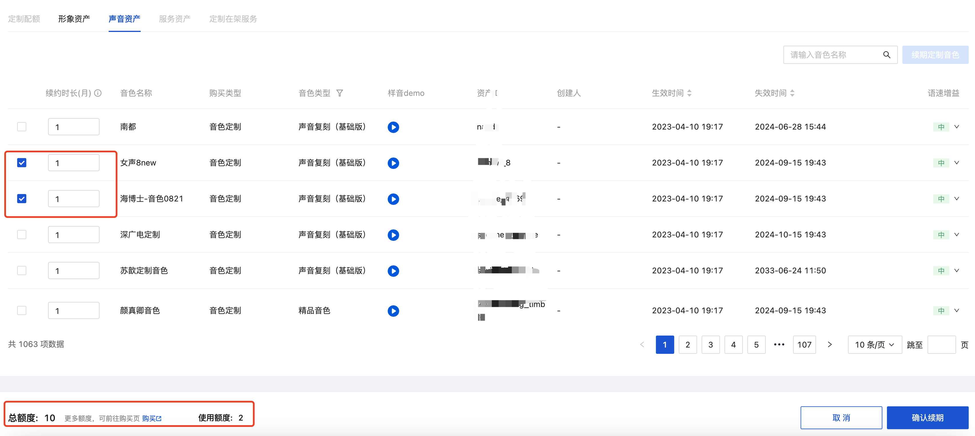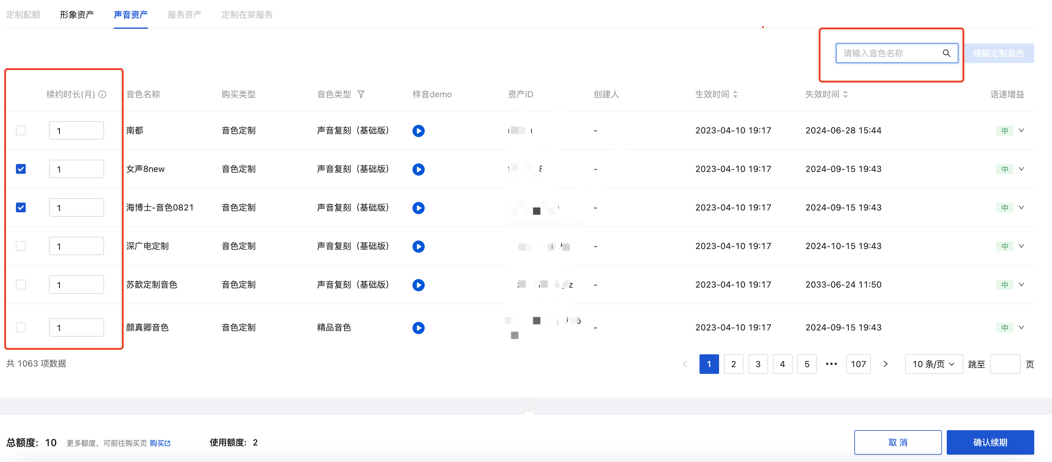 进入续期页面,可通过搜索音色名称寻找待续期音色,通过勾选选择对应的音色。