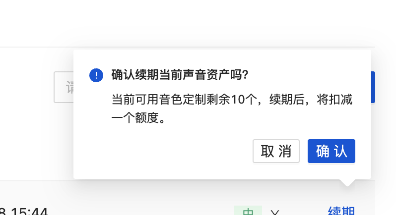 单击续期按钮后,需要进行二次确定。单击确定后,在架服务包配额相应扣减,对应音色有效期已刷新,失效时间延长一个月。