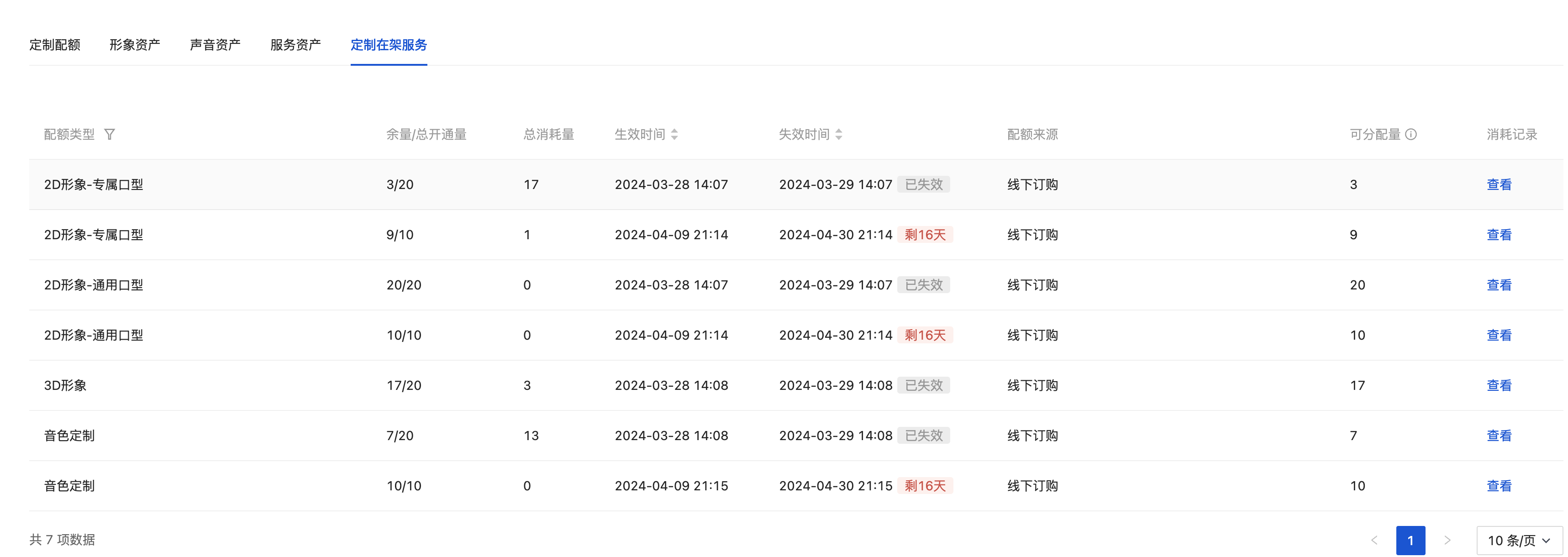 2. 在架服务包可在数智人购买页进行购买,在架服务包仅支持按月包的方式进行购买,若期望按年对形象续期,可通过一次性购买12个月包的方式进行。需注意,在架服务包购买后有效期为一年,超出资源生效期后将无法使用。 3. 单击消耗记录查看按钮,可查看对应配额的消耗情况。