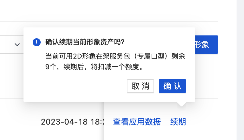 对单条形象资产或者音色资产进行单月续期,可通过单击资产操作列表中的续期按钮进行快捷续期,具体操作如下:
