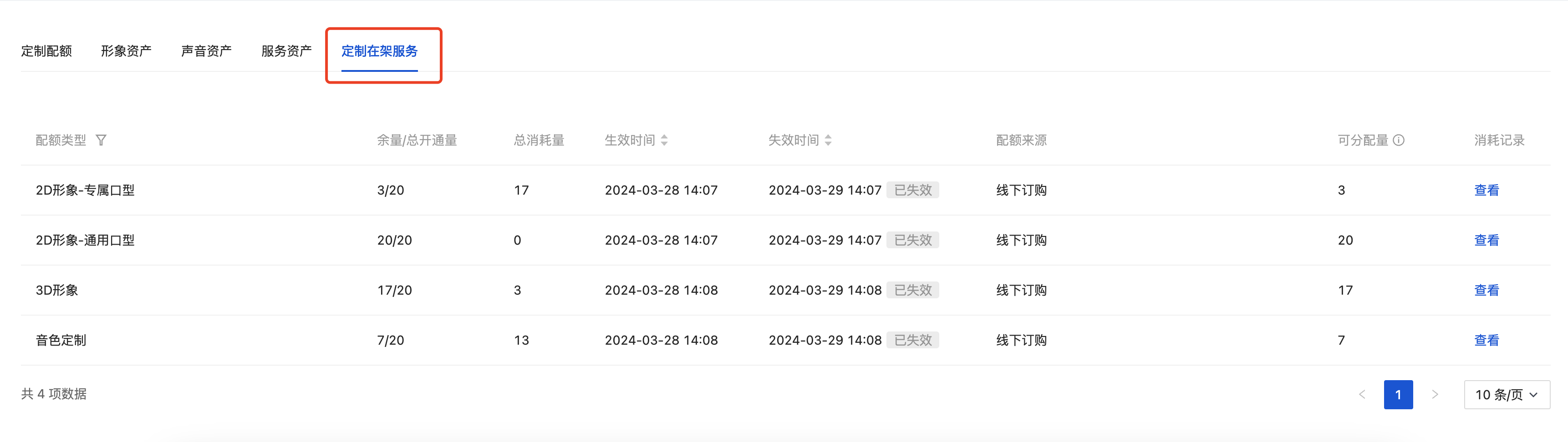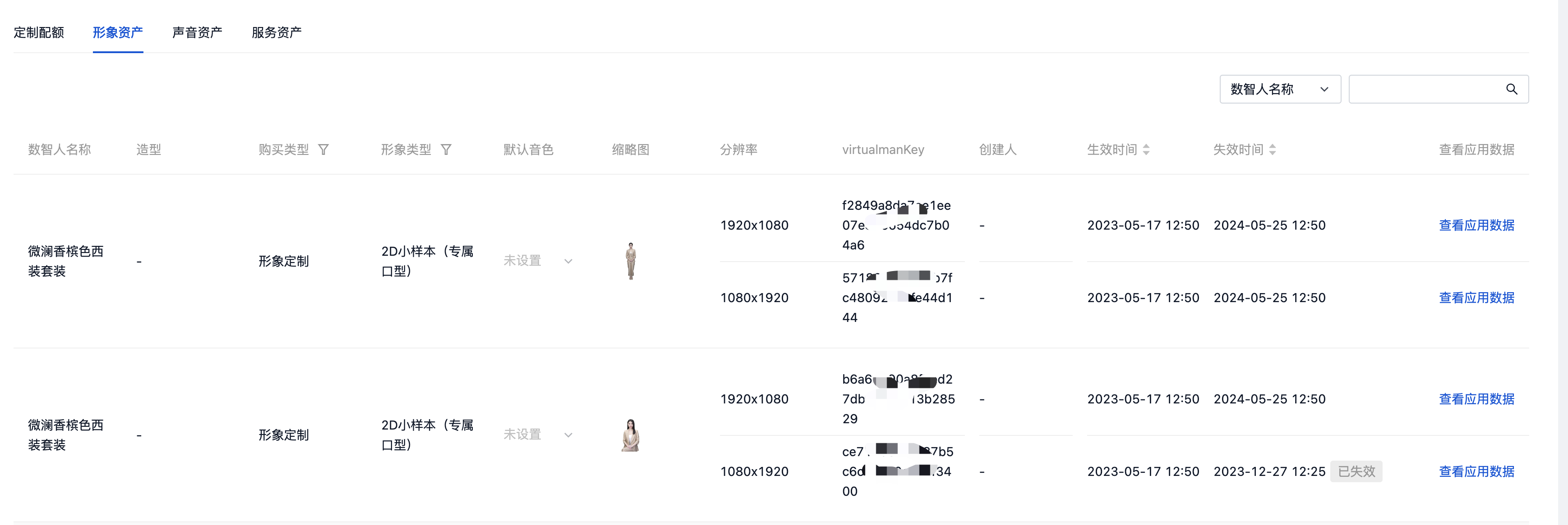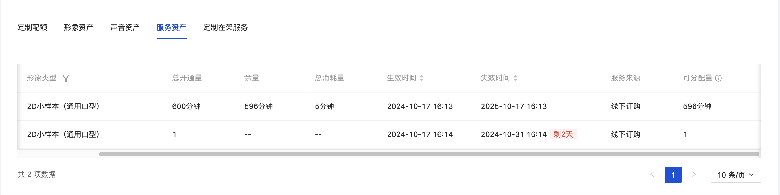 您可查看您订购的服务资产详情,包含可支持的形象类型、有效期、资产余量等。