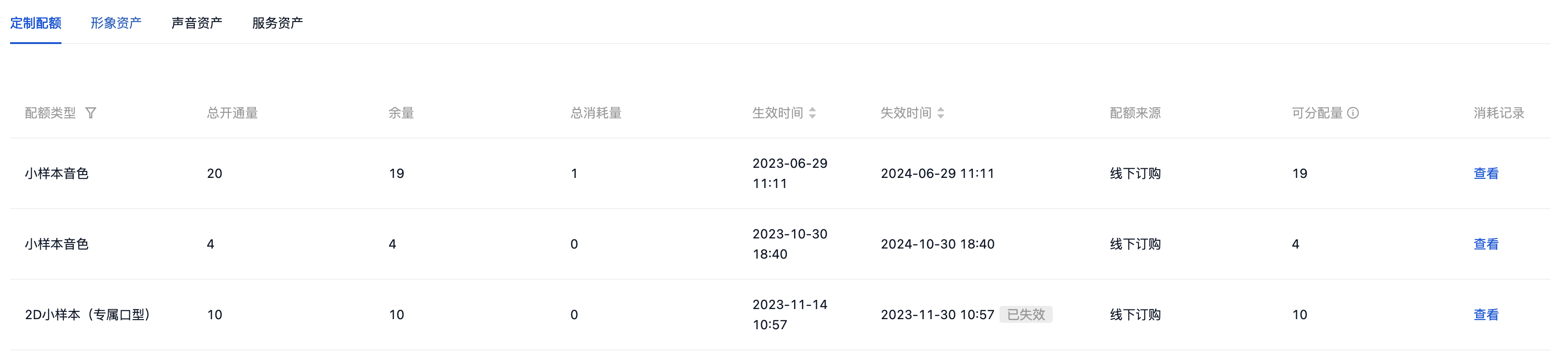 可查看您订购的2D小样本形象定制配额,包含配额类型、有效期、资产余量、消耗记录等。