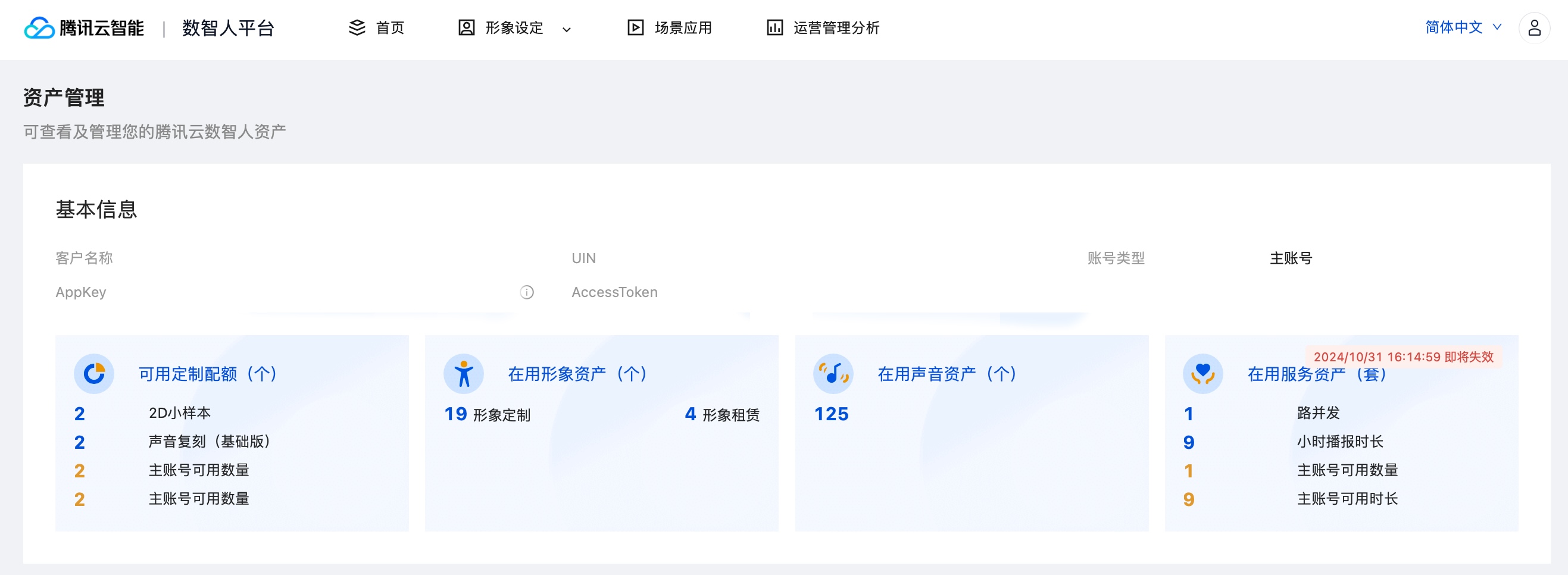 个人资产页面,客户可以通过此页面申请资产领用、查看资产信息、查看和管理账号内的(形象资产、音色资产、服务资产、定制配额)等。