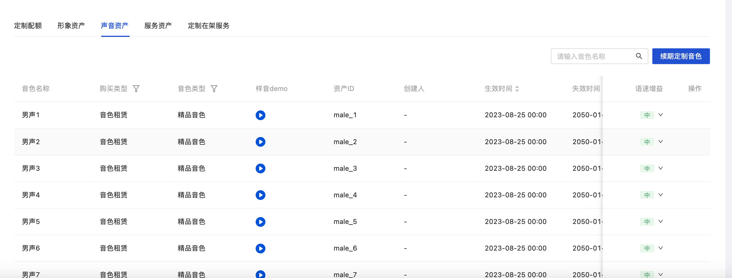 可查看您租赁的标准音色、定制的专属声音,可对声音设置全局语速增益,也可续期定制音色。