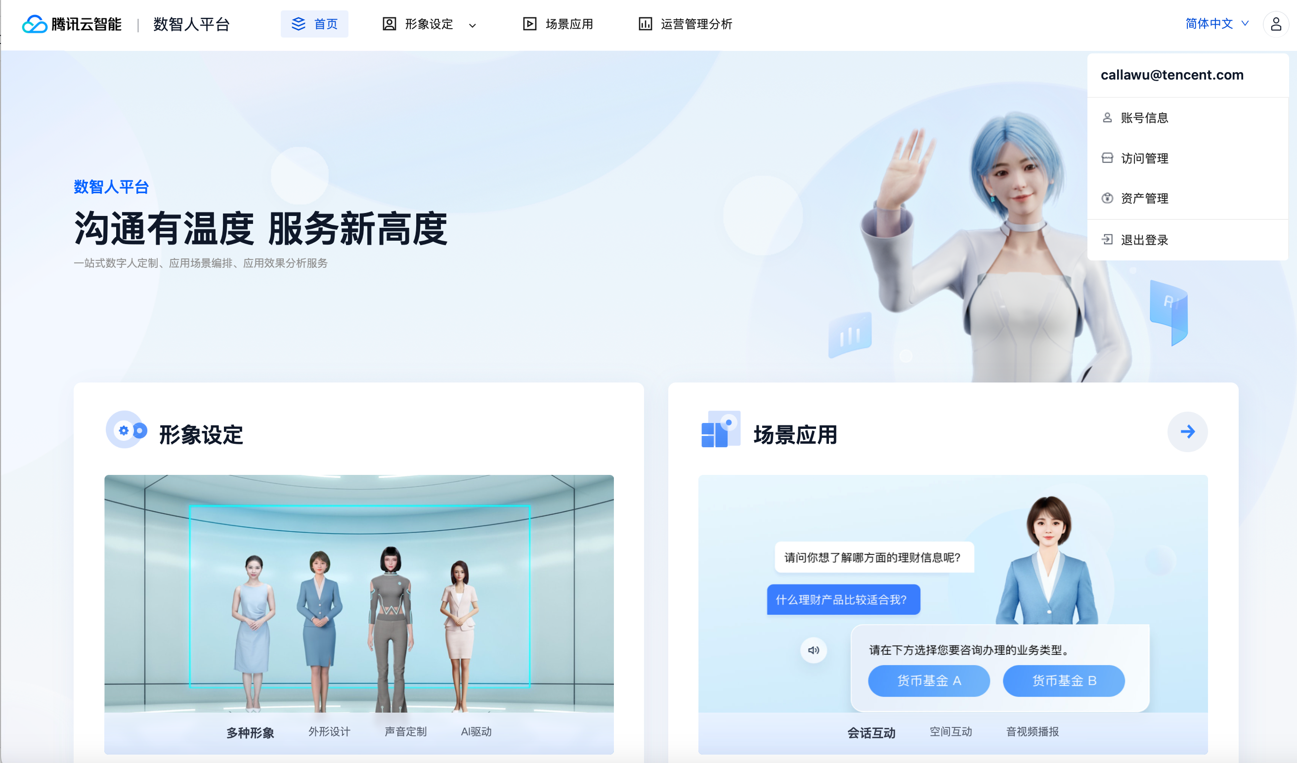 通过腾讯云智能数智人平台,单击右上角我的头像,可以进入资产管理页面。