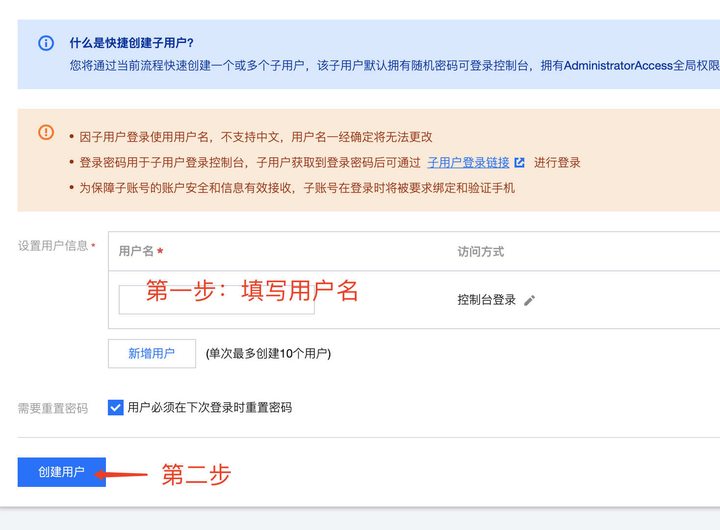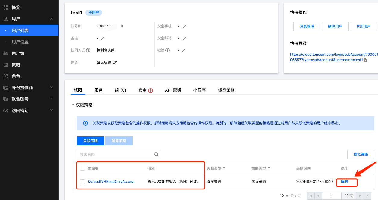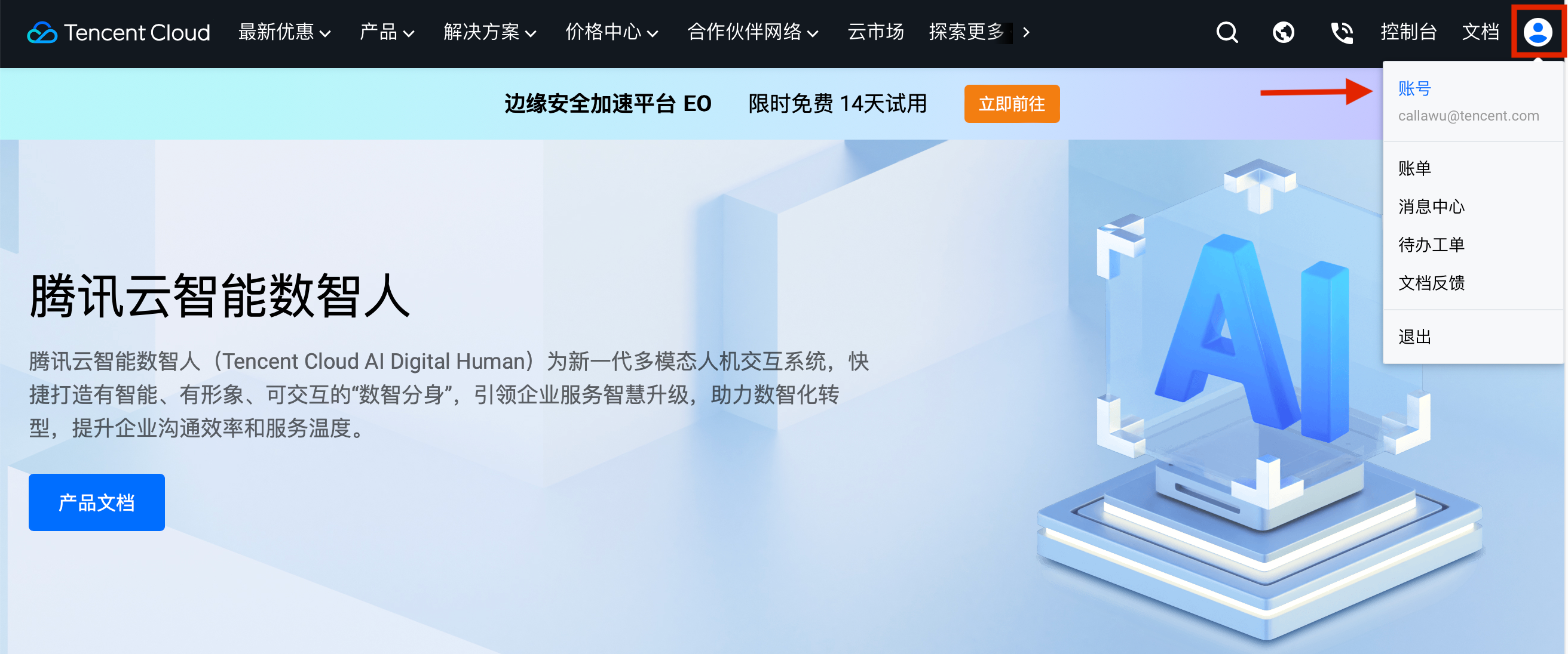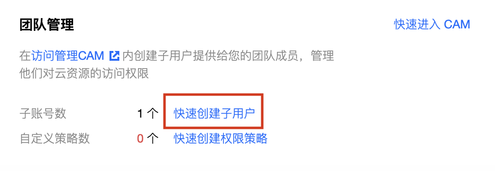 权限管理入口:通过主账号访问腾讯云智能数智人腾讯云智能控制台,进入右上角“账号”。如下图所示: 在页面左下方 团队管理中,选择“快速创建子用户”