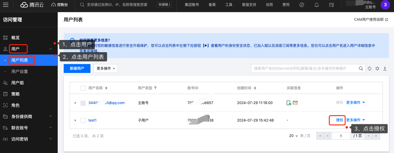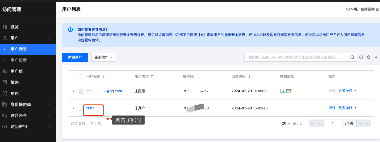 选择用户 > 用户列表 > 选择您需要授权的子账号,如下图:
