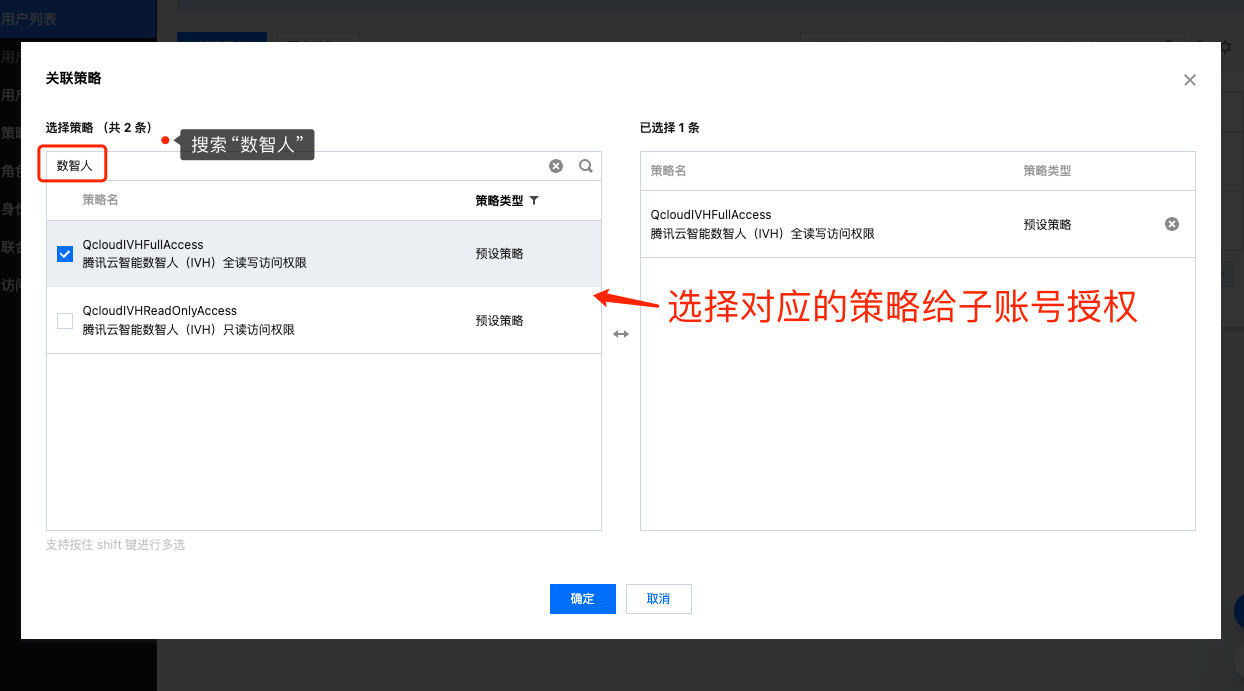 单击授权后,在选择策略中搜索“数智人”,选择对应的策略给账号授权后,单击确定即可,如下图: