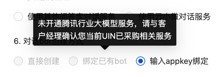 绑定腾讯行业大模型对话服务的方式有三种:“直接创建”、“绑定已有大模型应用”、“输入appkey”