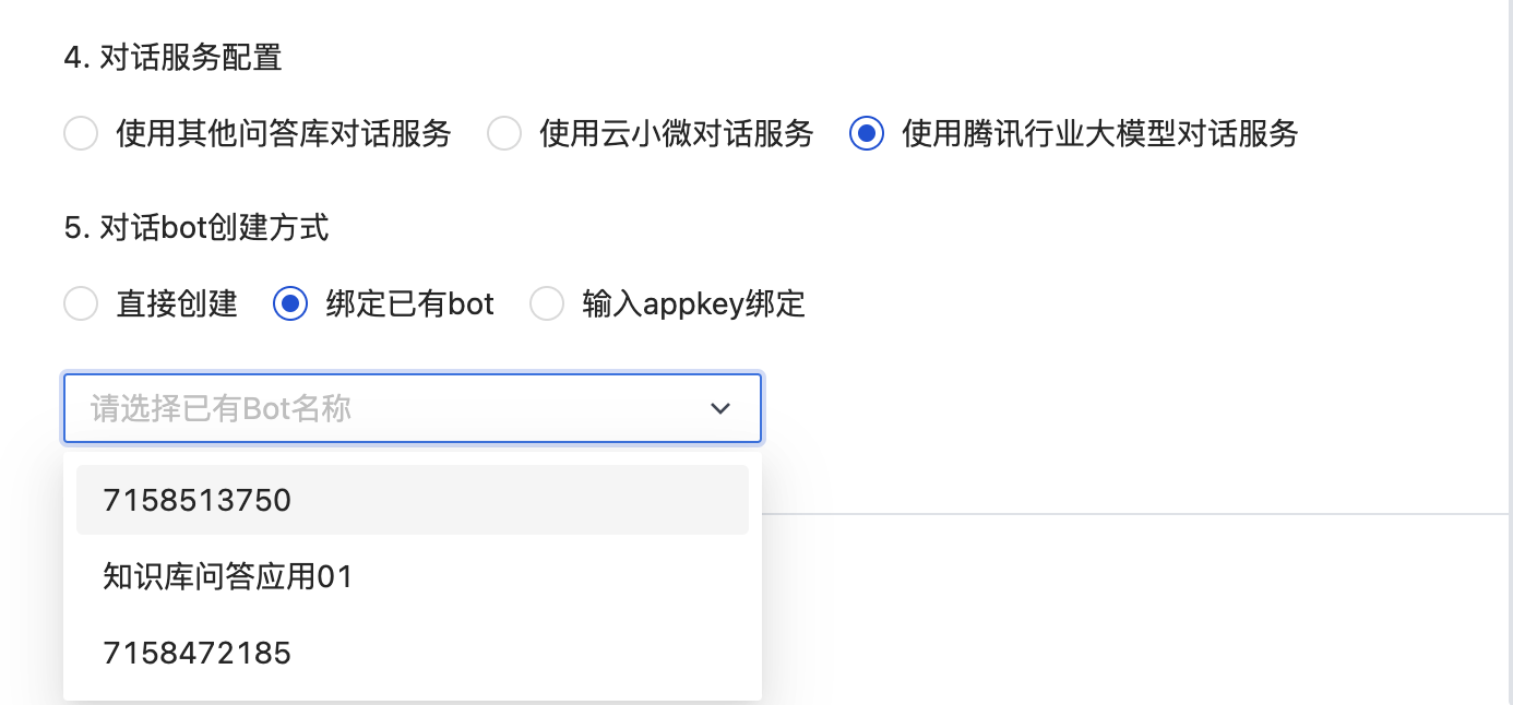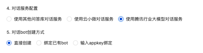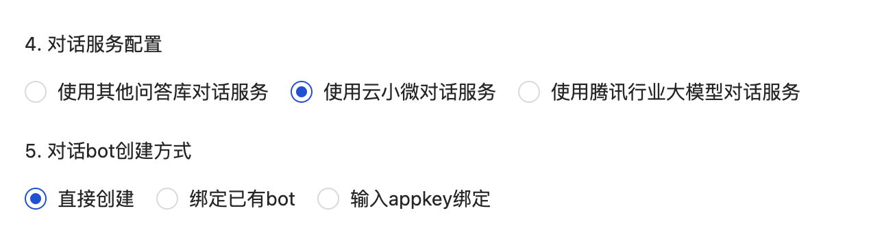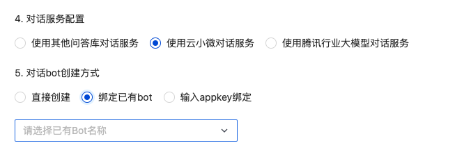 对话服务配置:可选择“使用其他问答库对话服务”,“使用云小微对话服务”、“使用腾讯行业大模型对话服务”。