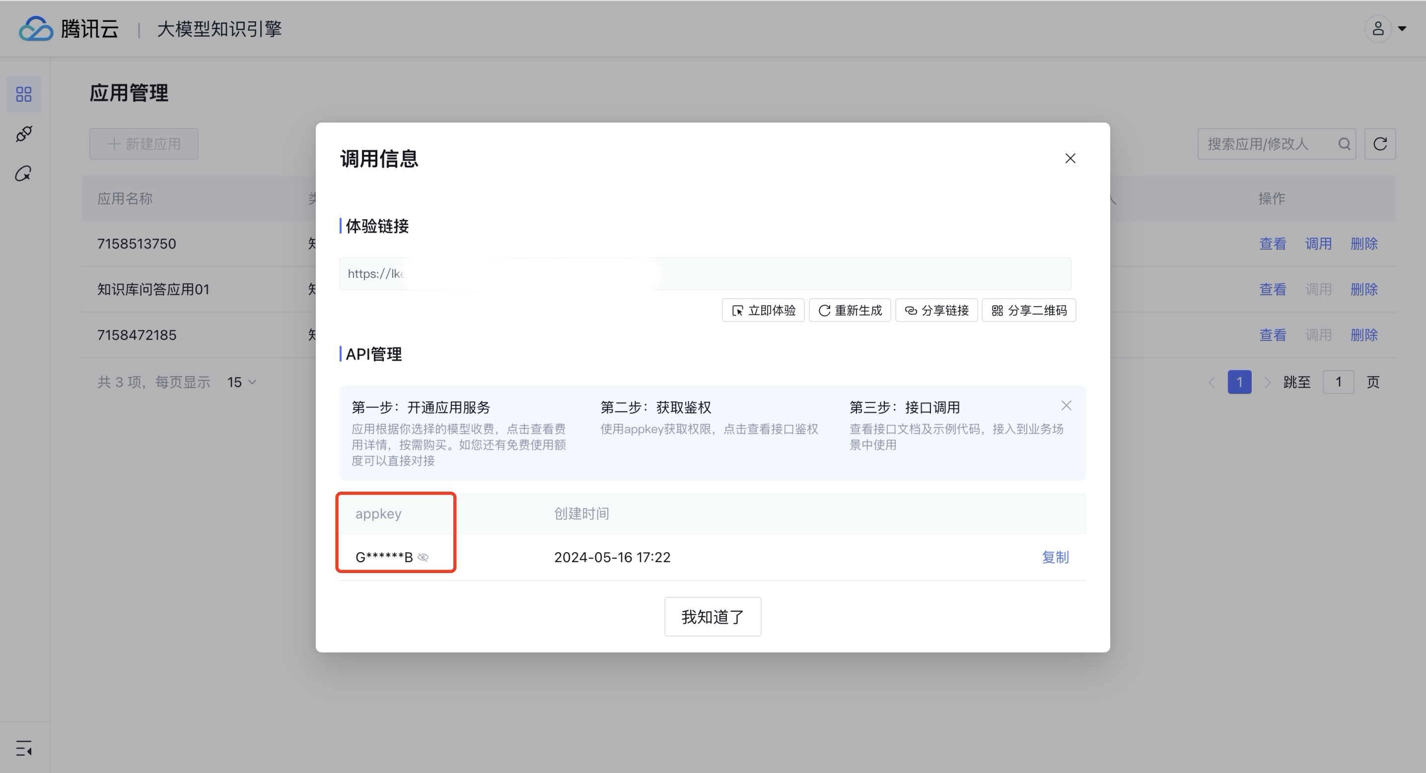appkey获取方式如下图(可以是非本人创建的)大模型知识引擎配置端>应用管理>调用