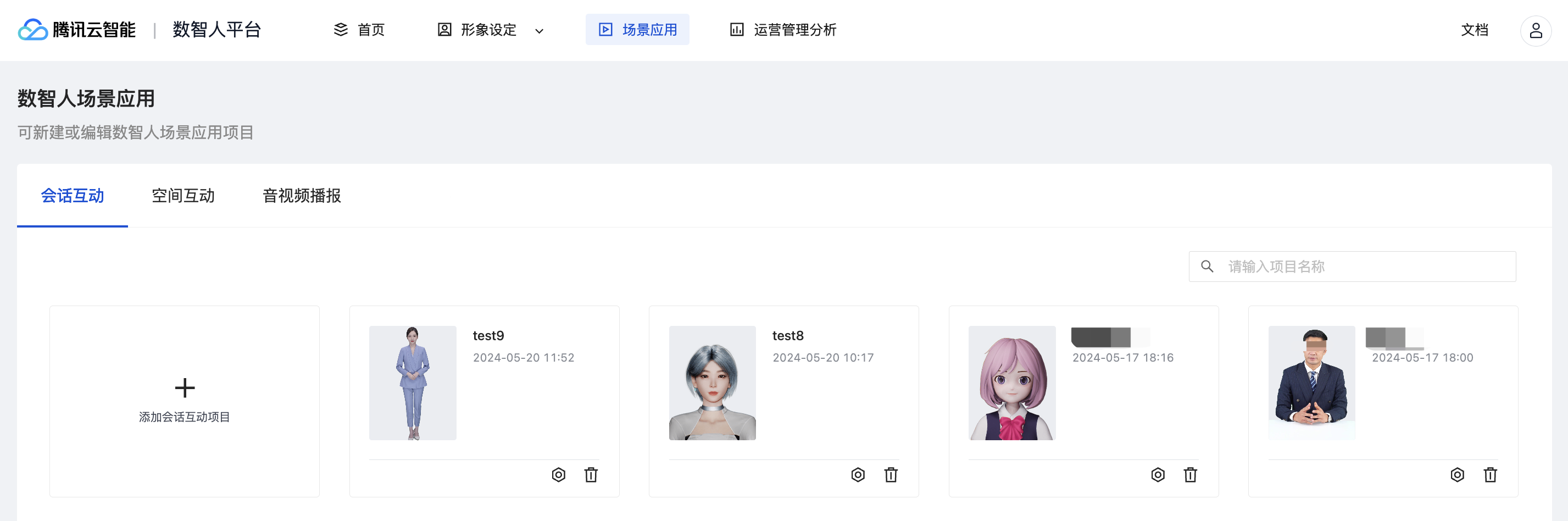 支持创建管理多个数智人项目。用户登录后,在首页单击创建数智人项目后,输入名称、描述等,即可新建数智人项目,也可对已存在的数智人项目进行删除或者编辑操作。