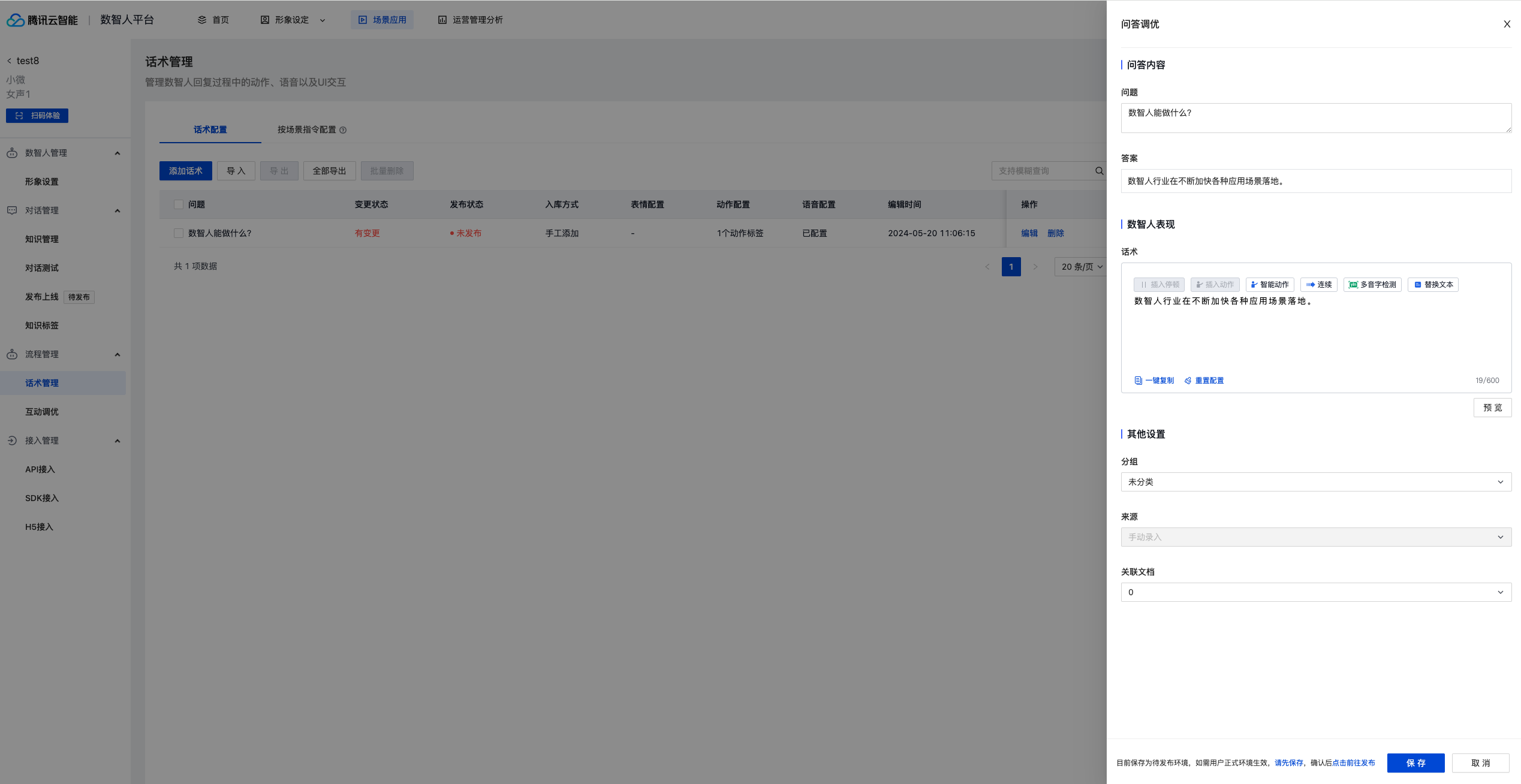编辑问题以及相应答案,答案会自动同步至话术部分,可在话术编辑窗进行停顿/连续/动作等相应文本设置