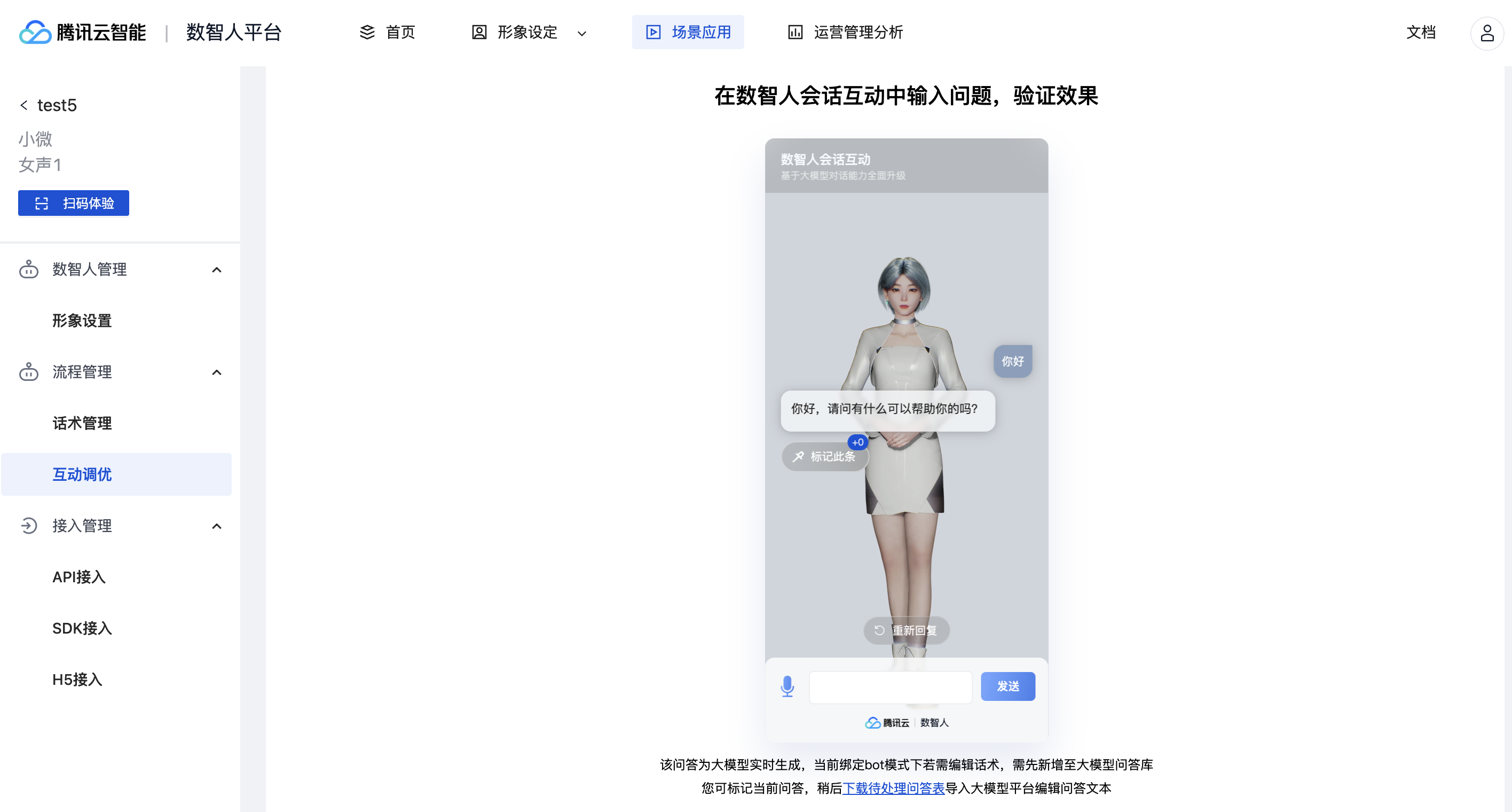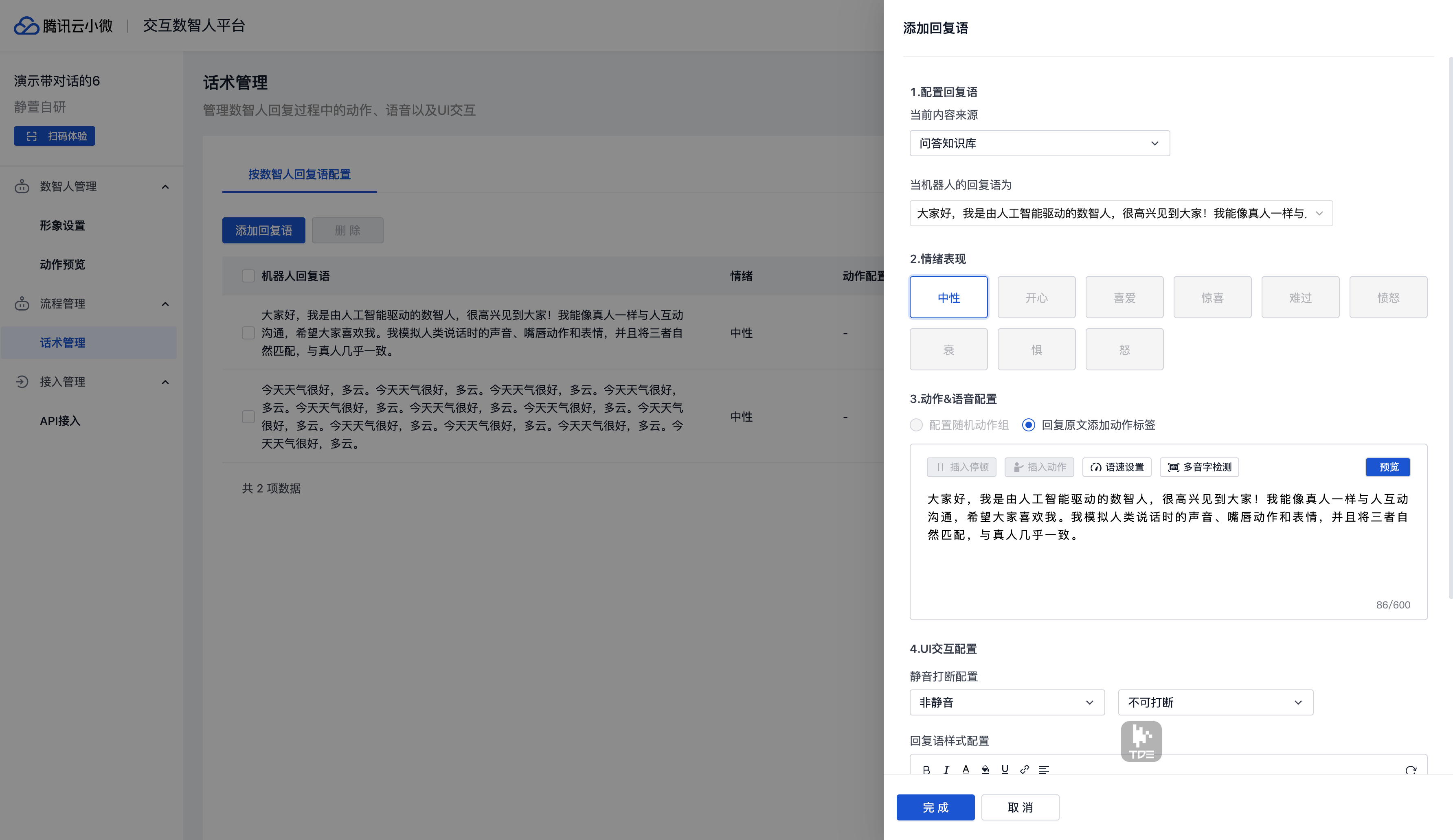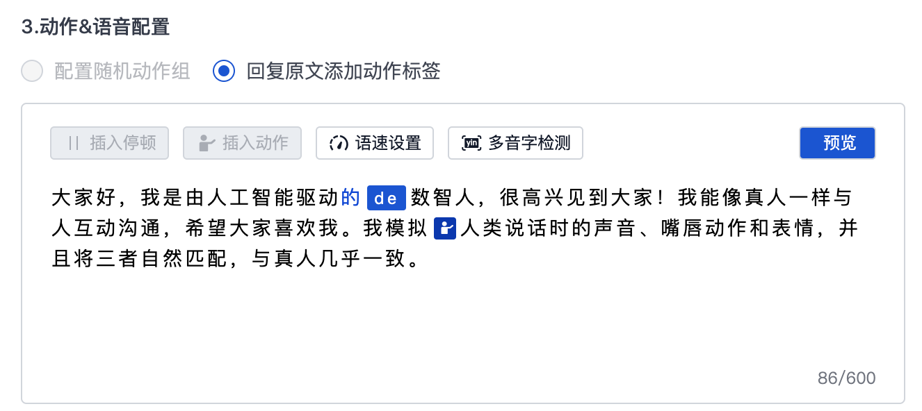 支持对回复语进行语音、动作标注,可进行实时的效果预览。