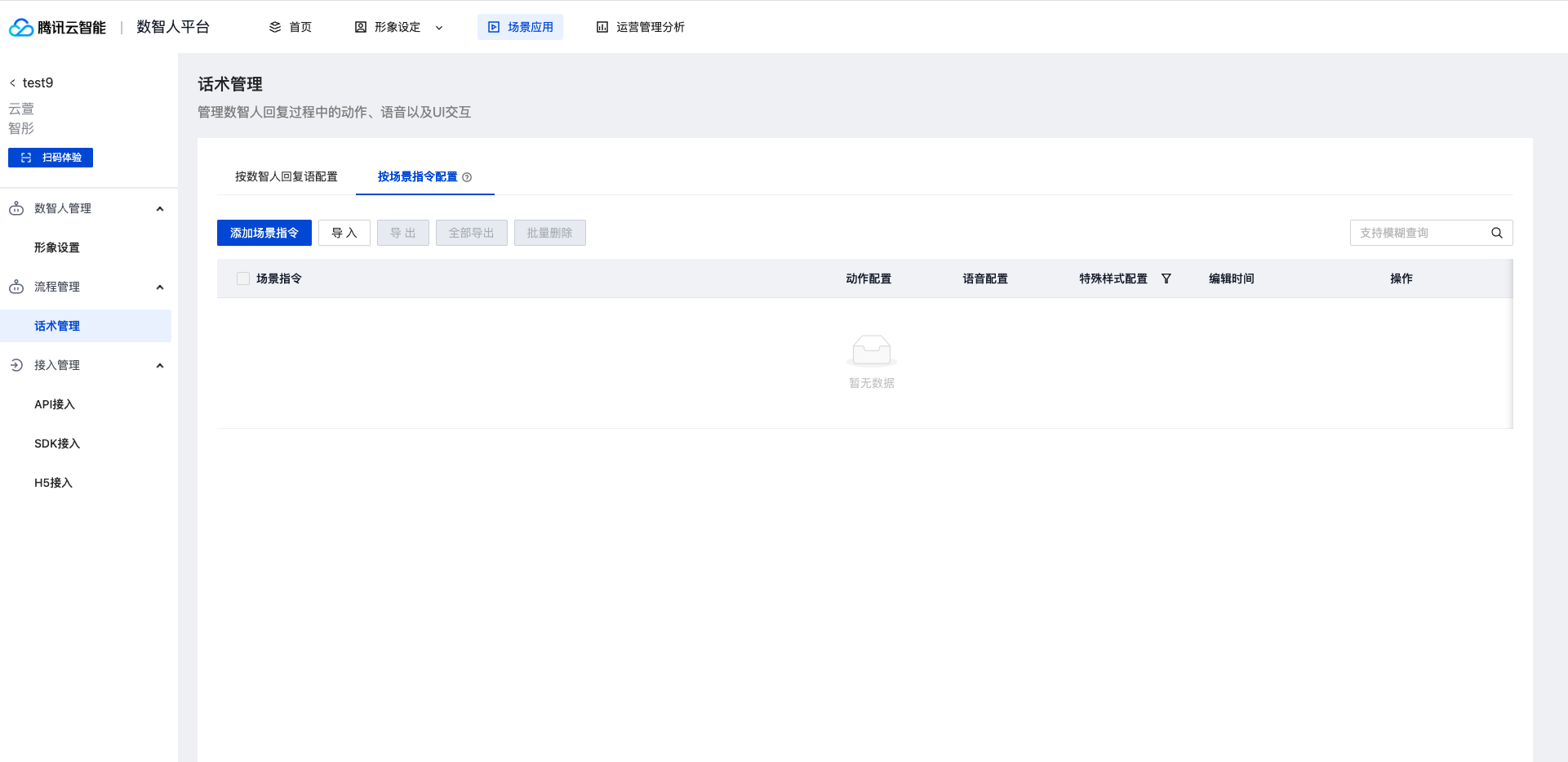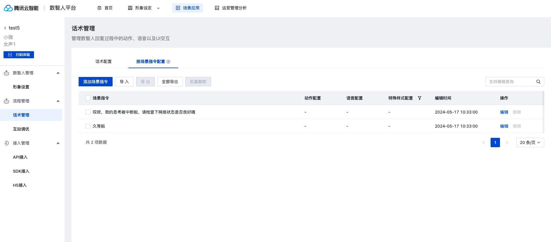 根据应用需求在此自定义场景,并配置各场景对应的指令、数智人动作&语音、特殊交互样式,配置内容将通过交互服务下发到应用端。
