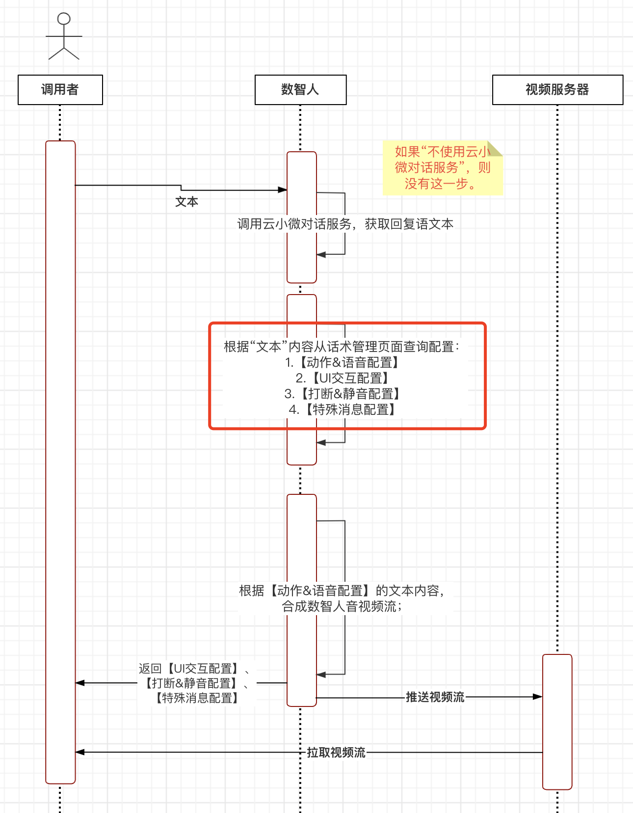 下图是交互数智人服务的整个调用流程,其中话术管理页面的作用见下图箭头处: