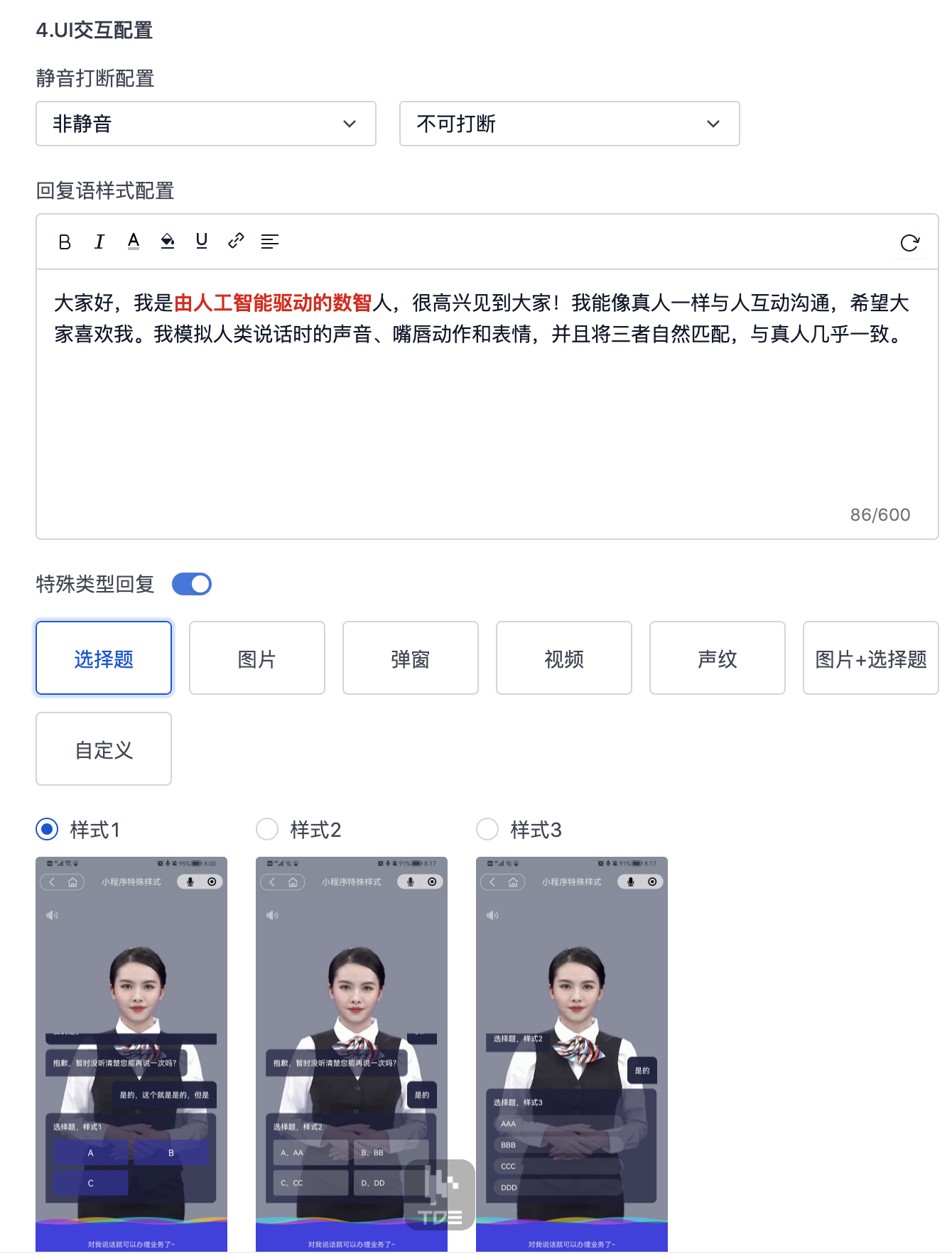 支持对回复语配置一些UI样式标注,选择题、图片等特殊的样式。这些配置需要业务系统读取这里的配置进行差异化的呈现.