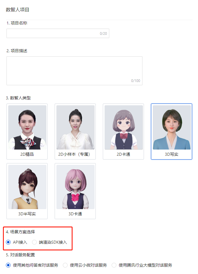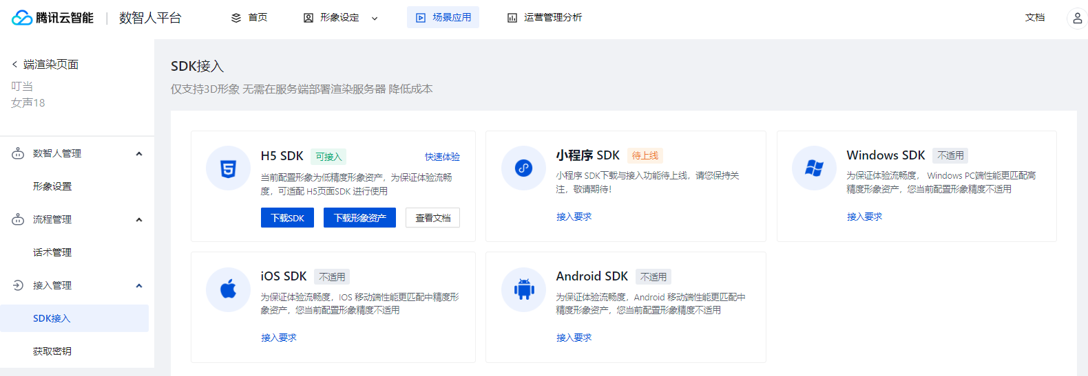 支持切换形象、切换服装 | 客户端渲染 SDK,如客户有多套形象或形象带有多套服装,可通过初始化接口更换模型。 服务端渲染 SDK,如客户有多套形象或形象带有多套服装,可通过数智人应用平台切换形象。 | 需要切换形象或服装 |