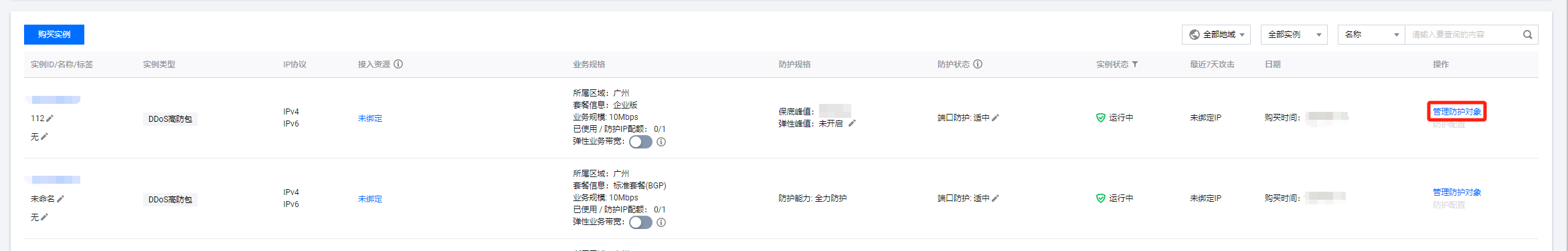 2. 在云上防护实例页面,选择目标实例,单击操作列的管理防护对象。