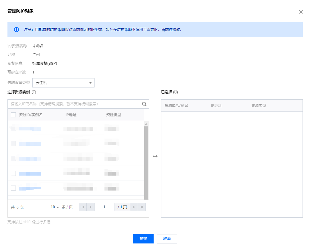 选择资源实例:允许多选,“选择资源实例”数量不得超过可绑定 IP 数。