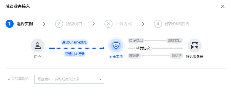 3. 在域名业务接入页面,选择关联实例 ID,单击下一步:端口协议。
