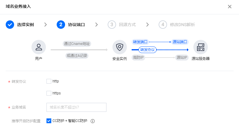 4. 选择转发协议和证书,填写业务域名,单击下一步:回源方式。