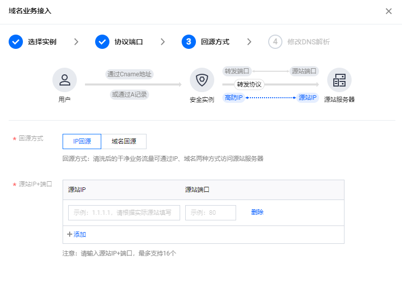 5. 选择回源方式,填写源站 IP+端口或源站域名。单击下一步:修改 DNS 解析。